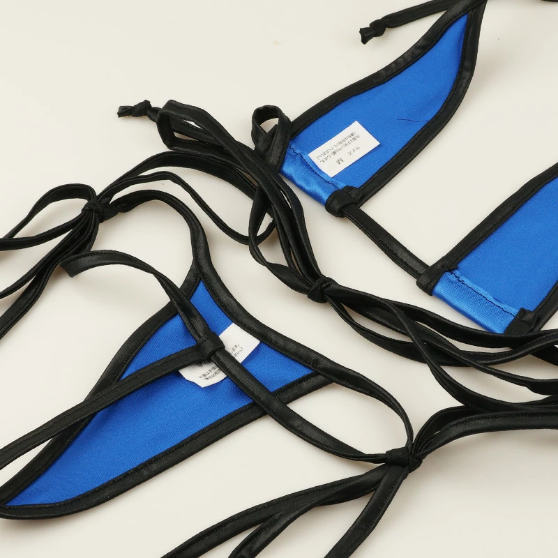 薄手で生地の表面に特殊な加工をし表面は光沢があり滑らかでヌメリ感のある伸縮性に優れたのが特徴のK2S生地を使用した三角ビキニセットになります。全カラーブラックパイピング仕様で生地の面積がとても小さいマイクロビキニになります。