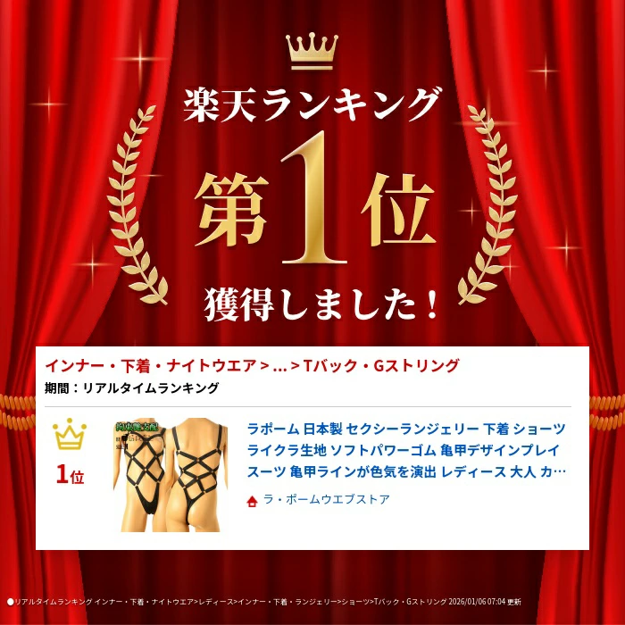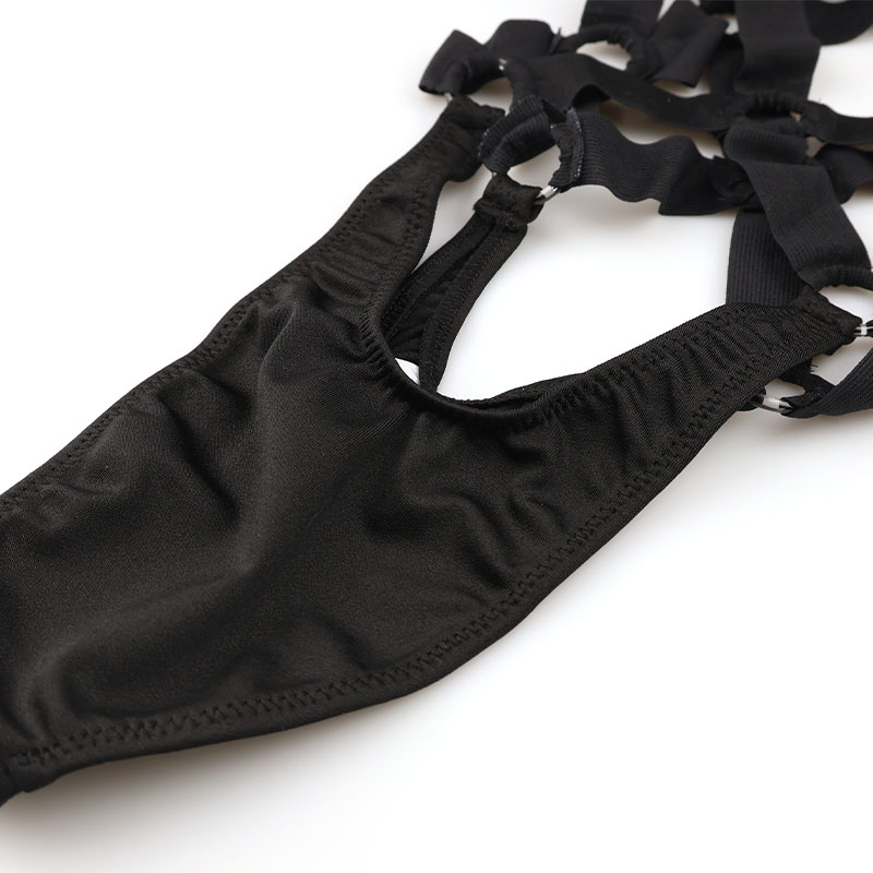 発色がよく光沢感のあるライクラ生地を使用した、セクシーなコスチュームランジェリーのプレイスーツ。ハリのあるしっかりとした伸縮性で身体に吸い付くようにフィットし、美しいシルエットを際立たせます。デザインは、視線を惹きつける 亀甲縛り風スタイル。ソフトながら適度なパワーのあるゴムを使用し、心地よいホールド感と大胆な肌見せを両立しました。印象的な光沢×拘束風デザインが魅せる、とびきりセクシーな一着。特別なシーンをより刺激的に演出するランジェリーです。