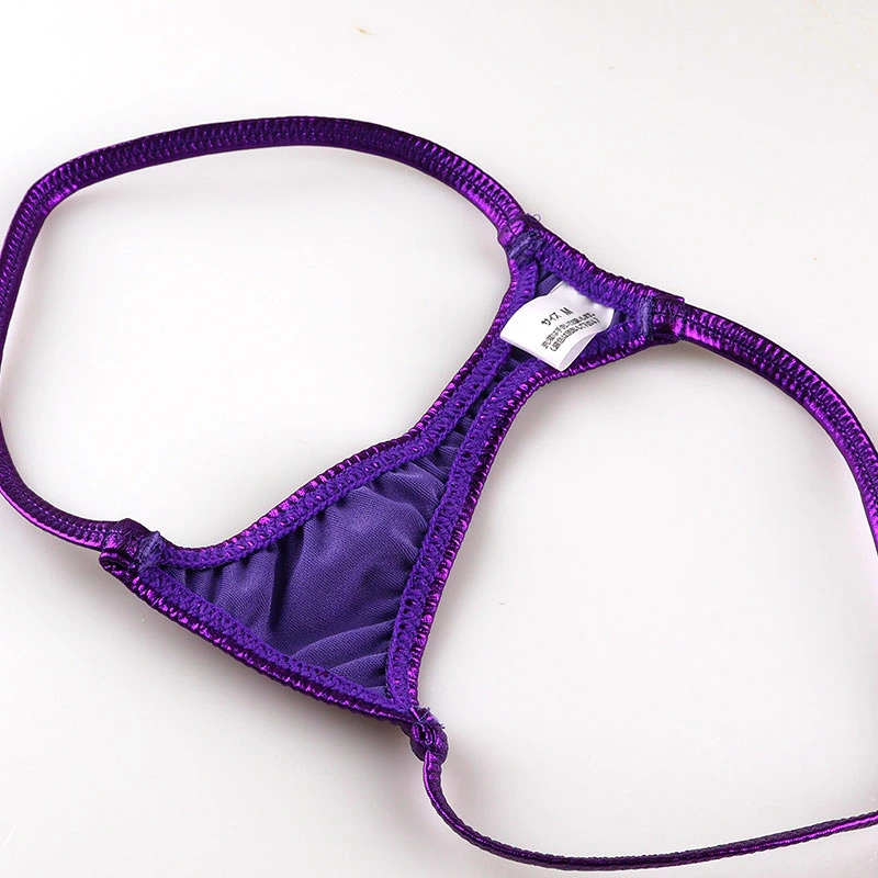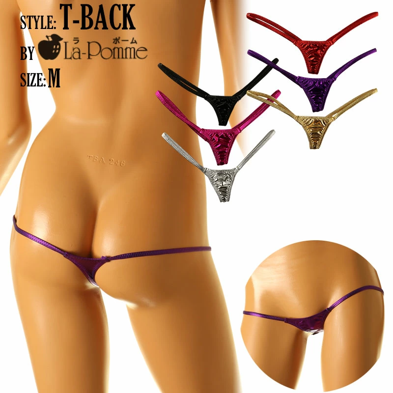 キラキラし艶やかに輝き伸縮性もあり表面はヌメリ感のある肌触りが特徴のメタリック生地を使用したTバックショーツになります。限りなく面積が小さく股上が浅くなったマイクロミニミニランジェリーになります。