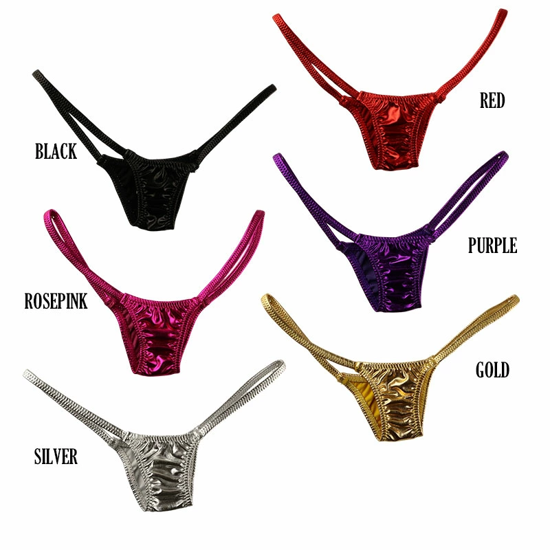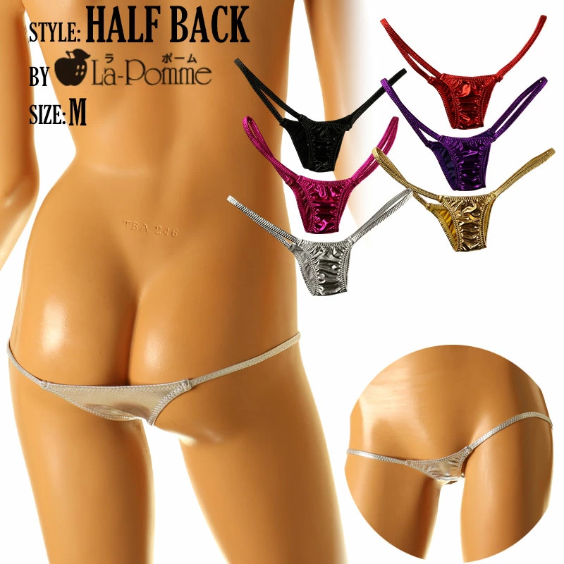 キラキラし艶やかに輝き伸縮性もあり表面はヌメリ感のある肌触りが特徴のメタリック生地を使用したハーフバックショーツになります。限りなく面積が小さく股上が浅くなったマイクロミニミニランジェリーになります。