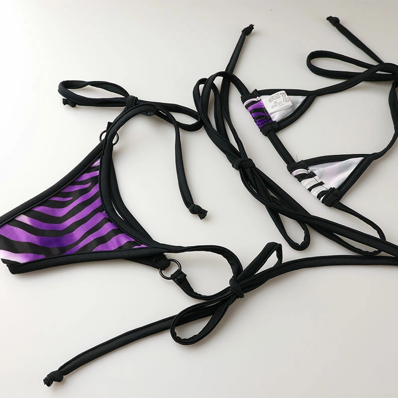 生地の表面い光沢感があり抜群の伸縮性になったシルキーで気持の良い肌触りが特徴でゼブラプリントの上下セットになります。三角ブラとハーフバックショーツのランジェリーセットになります。極限まで小さくしたデザインでブラもショーツも全てヒモ結びになったマイクロミニビキニになります。