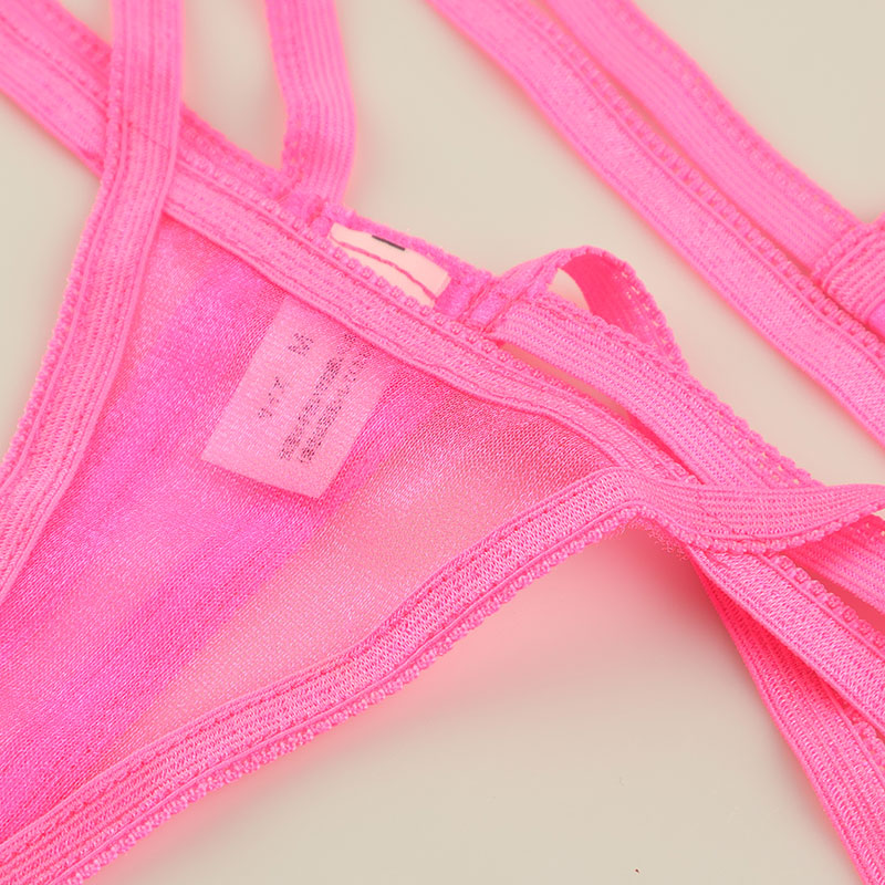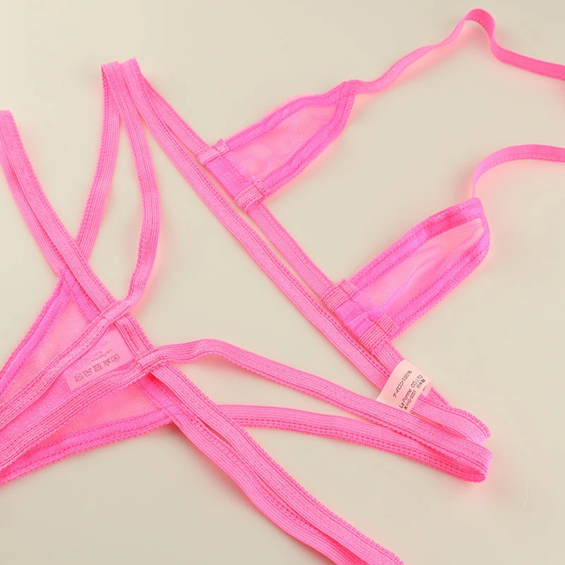キラキラと輝くミストラメ入りのシースルー生地は、微細なラメ糸が織り込まれており、光に当たるときらめきが美しく輝きます。透明感のある素材なので、肌や下に着る衣類が透けて見え、セクシーで魅力的な印象を与えます。その柔らかな手触りは、身体に優しくフィットし、洗練されたスタイルを演出してくれるスパークハーフ生地を使用したマイクロミニビキニセットになります。生地の面積が小さくなった三角ブラと脚長効果のあるハイレグデザインが特徴の極小ランジェリーになります。
