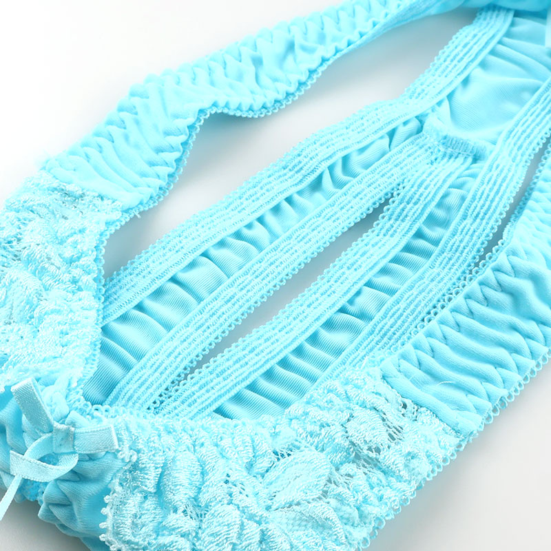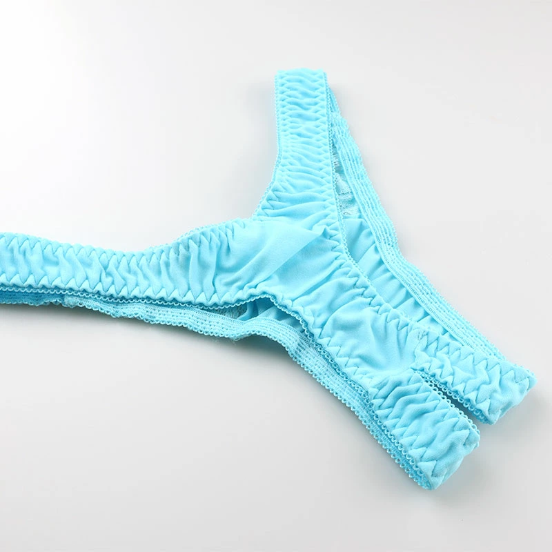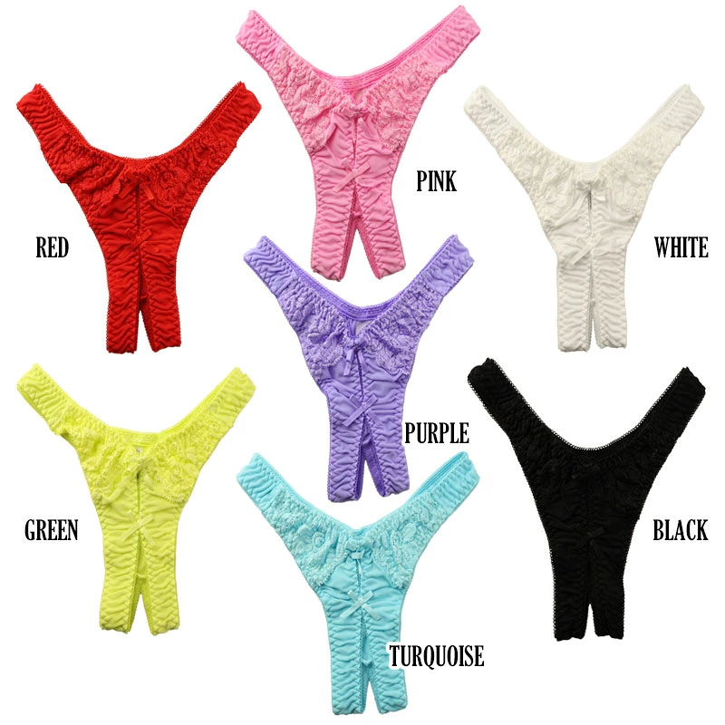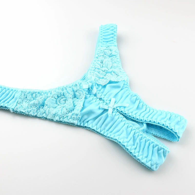 少し透け感のある薄さでしっとりとしてサラサラな気持ちのいい肌触りが特徴のSSS生地と透け感のあるストレッチレースを使用したTバックショーツになります。大胆なデザインのオープンクロッチになった股ワレランジェリー。