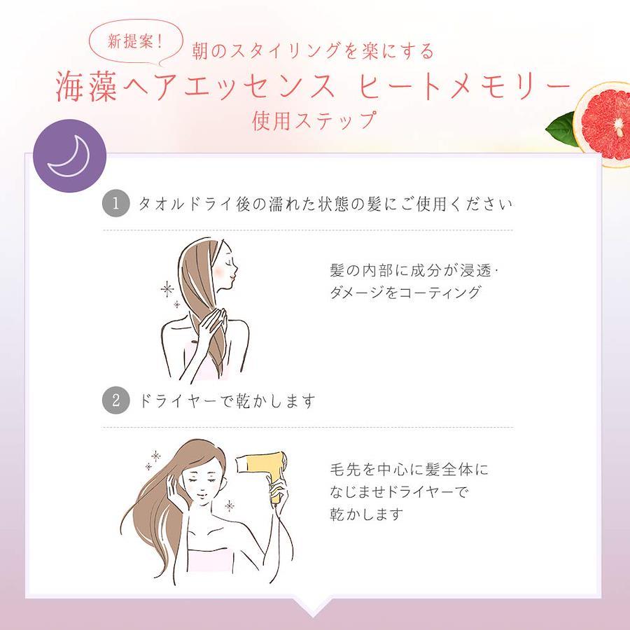 3営業日以内に発送≪新品未開封品≫:【キューティクルケア×スタイルキープ】ダメージを補修しながら、朝のスタイリングを楽にするセット力があります。寝ぐせがつきにくく、ブラッシングするだけでまとまった髪へ。翌朝は何もつけなくても、ヘアアイロンだけで楽々セット&朝の時短に。「ヒートメモリー」だから、熱を味方にストレートヘアも、カールヘアも、決めたスタイルを長時間キープします。【熱を味方に髪型を長時間キープ】一度決めたヘアスタイルが崩れるのは、湿気が原因…。髪が水分を吸収し水素結合が切れて向きを自由に変えられる状態になるから。ヒートメモリーをつけてドライヤーで乾かすと、ダメージ部分をしっかりコーティングするとともに、水素結合がくっつき整った髪を作ることができます。さらに、朝のスタイリング時にヘアアイロンなどの熱をあてると、さらにしっかりと結合し、スタイリングした髪をキープします。【使用方法】Step1.洗髪後、タオルで軽くおさえるようにして、余分な水分を拭き取ります。Step2.手のひらにヘアエッセンスを適量取り、毛先を中心につけた後、髪全体になじませます。Step3.根元から毛先に向かってドライヤーで乾かします。最後に冷風で仕上げるとツヤ感がアップします。夜に使用すれば、翌朝は何もつけなくてもドライヤー・コテ等でセットした髪型が長続きします。【ヘアアイロンは低温度(150℃)でも、しっかりセット!】密着力のある美髪成分※が髪表面のキューティクルを保護。髪の滑りが良くなり、ドライヤーやヘアアイロンなどによる摩擦や熱によるダメージを抑えます。また、朝のセット時は低温度(150℃)でもしっかりセットされるため、高温によるダメージもケアできます。※PPG-3カプリリルエーテル、γ-ドコサラクトン、ビスセテアリルアモジメチコン【内容量】75ml(約2ヵ月分) 【製造国】日本 【香り】爽やかなピンクグレープフルーツの香り 【成分】防腐剤フリー・無着色 【使用量の目安】ショート:1~2プッシュ、セミロング:2~3プッシュ、ロング:3~4プッシュ