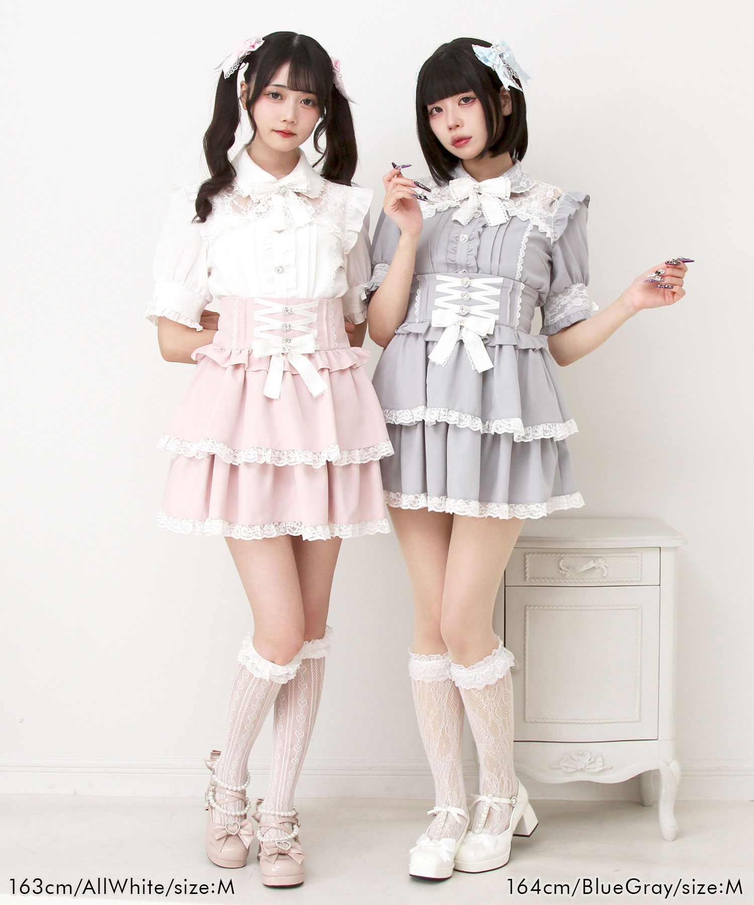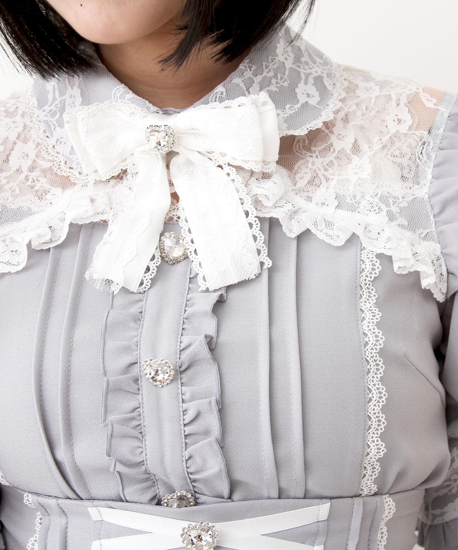 襟元リボンにもレース重ねて、キラキラハートのビジュー付きがときめくデザインです。