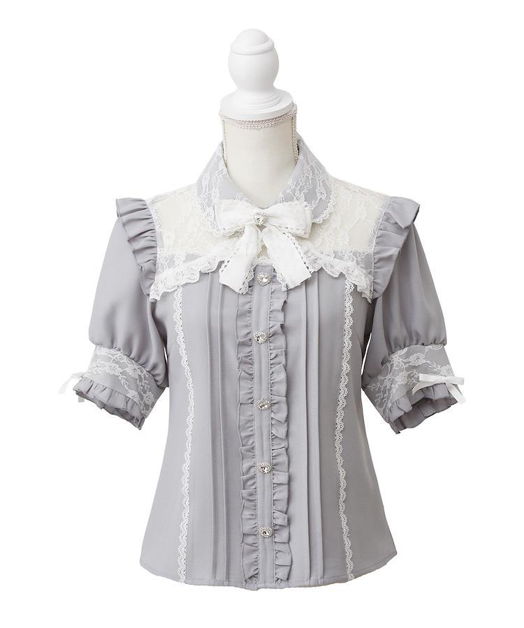 襟とカフスはレース重ね、肩回りはかわいく透け感があるレース切替デザインのブラウスです。