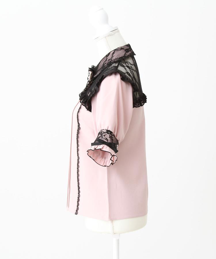 襟とカフスはレース重ね、肩回りはかわいく透け感があるレース切替デザインのブラウスです。