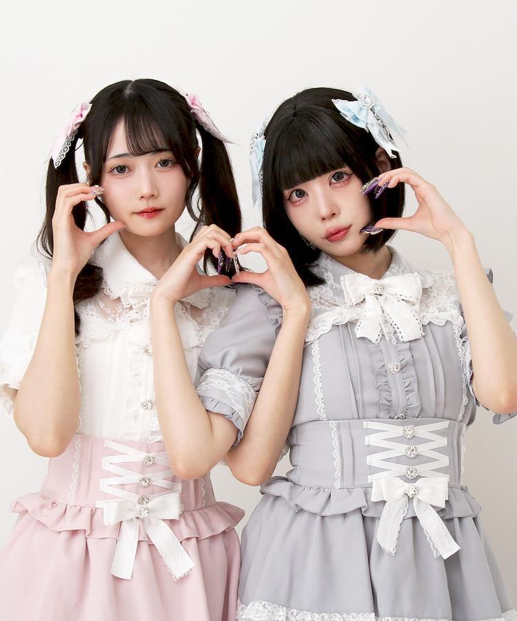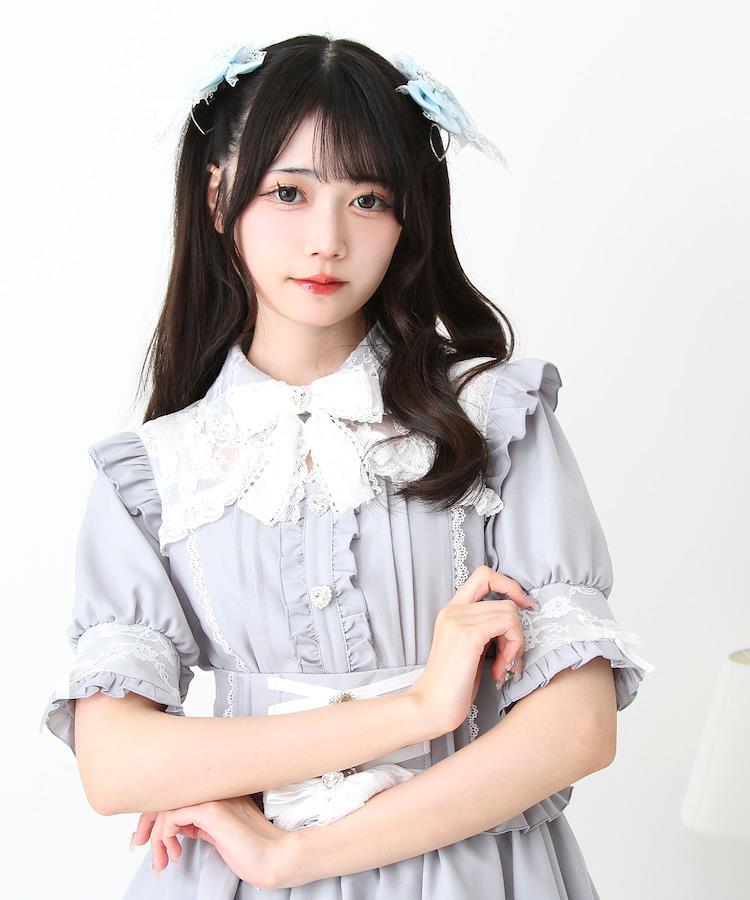 襟元リボンにもレース重ねて、キラキラハートのビジュー付きがときめくデザインです。