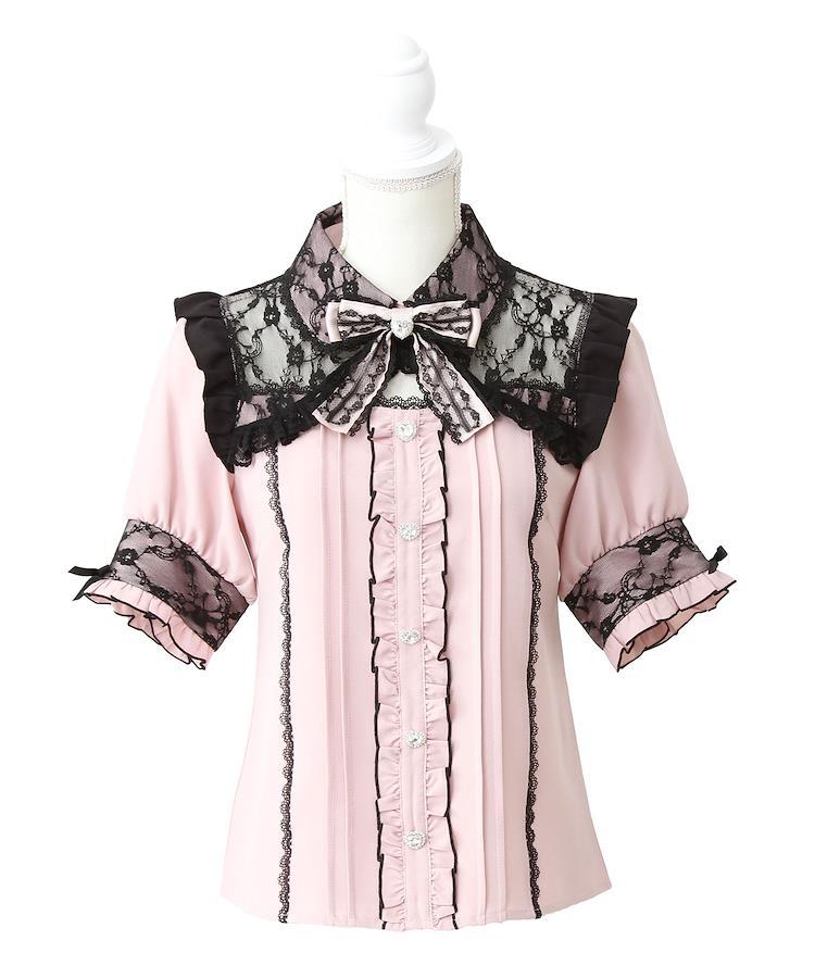 襟とカフスはレース重ね、肩回りはかわいく透け感があるレース切替デザインのブラウスです。