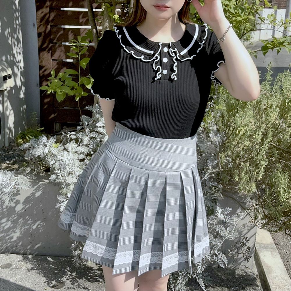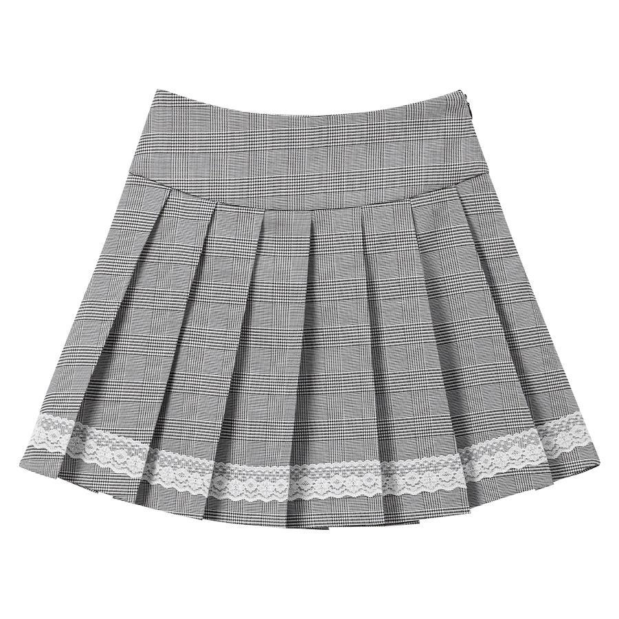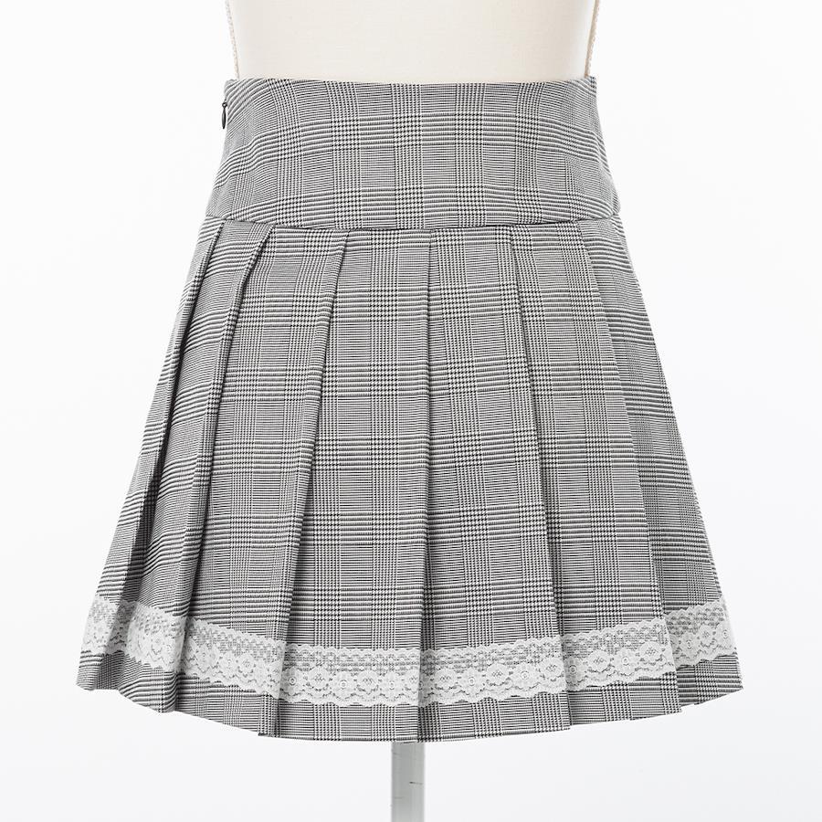 レーステープがポイントのチェック柄プリーツスカートのご紹介。【デザイン】シンプルなデザイン且つグレンチェック柄が甘すぎず、色んなトップスと合わせやすいプリーツスカート。裾のレーステープがトレンドライクでコーデのアクセントに♪脇ファスナーで着脱する仕様です。ウエストゴムは無いタイプになります。ウエスト切替巾を広めにして、ウエスト位置が高めに見えるようになっています。着回ししやすいデザインなのに、スタイルUPも叶う万能スカートです。