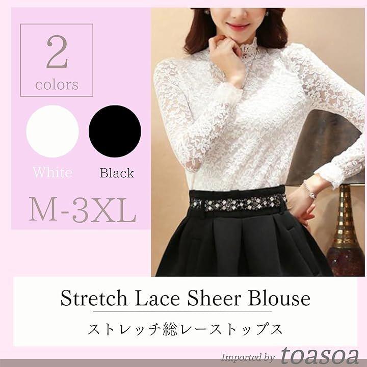 ハイネックの襟や長袖 袖口のレーススカラップがオシャレでシンプルなコーディネイトでもサマになる、大人のレースブラウスです。