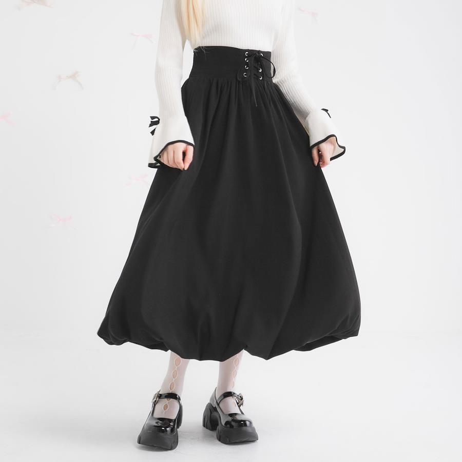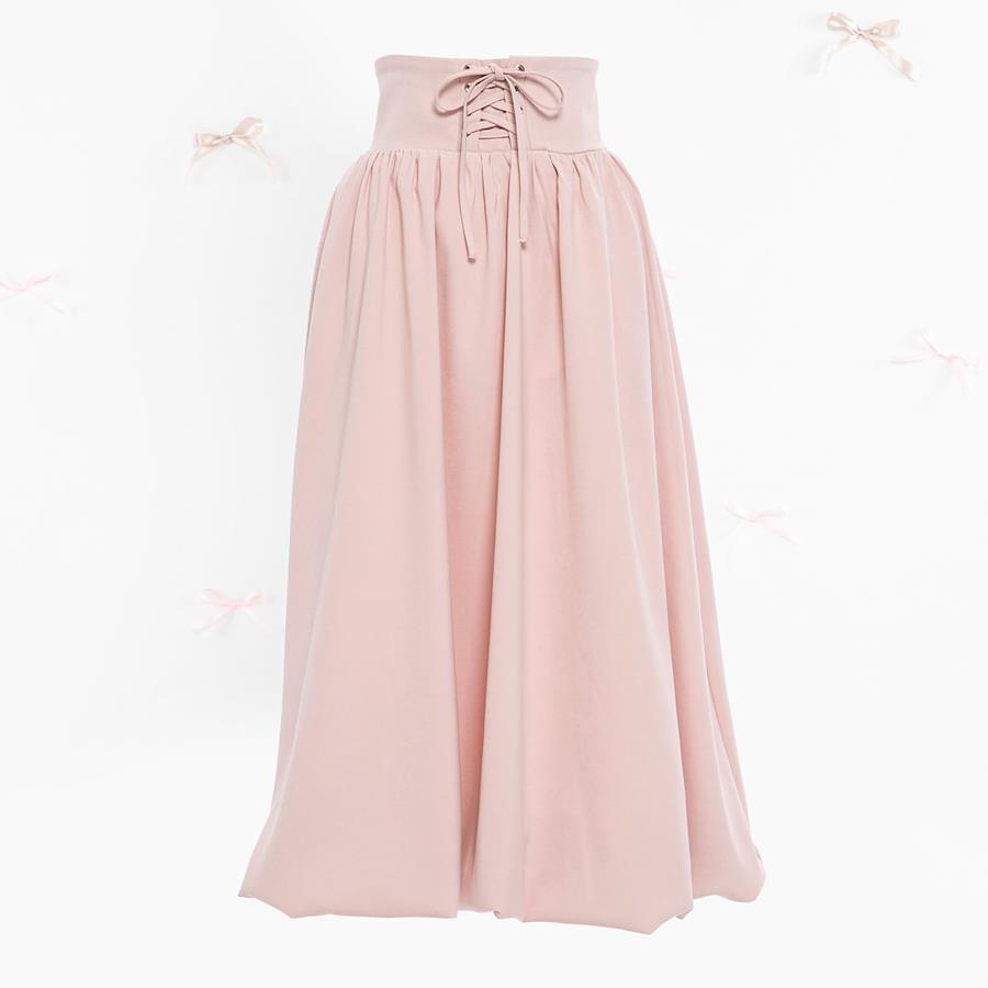 ふんわりとしたシルエットが可愛いバルーンロングスカートのご紹介。【デザイン】フロントのレースアップデザインがアクセントのロングスカート。シンプルながら、トレンドのバルーンシルエットがガーリーさをプラス。コルセットのようにウエスト切替巾が広めなので、きゅっ、ふわっのメリハリシルエットが叶います♪後ろウエストはシャーリングゴムになっており、着心地も楽ちんです♪レースアップ部分はご自身で結ぶ仕様なので、少しですがきゅっと締めてウエストも調整も可能です。