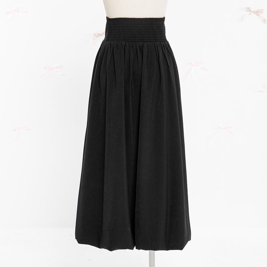 ふんわりとしたシルエットが可愛いバルーンロングスカートのご紹介。【デザイン】フロントのレースアップデザインがアクセントのロングスカート。シンプルながら、トレンドのバルーンシルエットがガーリーさをプラス。コルセットのようにウエスト切替巾が広めなので、きゅっ、ふわっのメリハリシルエットが叶います♪後ろウエストはシャーリングゴムになっており、着心地も楽ちんです♪レースアップ部分はご自身で結ぶ仕様なので、少しですがきゅっと締めてウエストも調整も可能です。