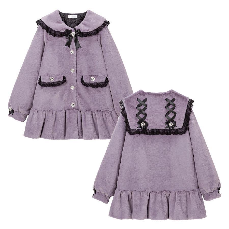 かわいいセーラー襟のふんわりファーコートが登場♪【デザイン】かわいいセーラー襟デザインのファーコートです♪フロントにはかわいいサテンリボンがついていてハートビジューがついています。釦部分にはキラキラのかわいいハートビジューボタン付き。シルエットはAラインでフレアがふんわりと広がります。襟部分にはかわいいレースがついています。袖口のカフス部分にもリボンがついていてワンポイントになっています。セーラー襟部分にはかわいいレースアップのデザインがあり、リボンもついているのもポイントです♪裏地には中綿入りのキルティングが入り暖かいファーコートです。【素材】表地はファー生地を使用しています。裏地には中綿入りのハートのキルティング生地を使用しています。スナップ釦にて釦の開閉ができます。【コーディネート】お気に入りのかわいいコーデにふんわりとしたかわいいコートを羽織ってお出掛けへ♪ミニ丈やすこし短めのワンピースを着用するとちらりとスカートの裾がチラ見えするのがまたかわいいです♪《透け感》なし 《生地の厚さ》厚手 《裏地》あり 《伸縮性》なし《生産国》中国