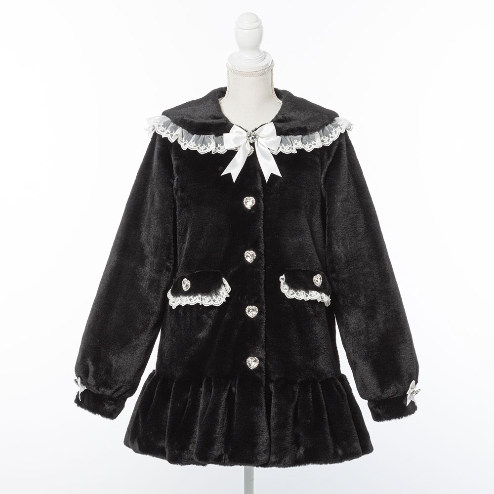 かわいいセーラー襟のふんわりファーコートが登場♪【デザイン】かわいいセーラー襟デザインのファーコートです♪フロントにはかわいいサテンリボンがついていてハートビジューがついています。釦部分にはキラキラのかわいいハートビジューボタン付き。シルエットはAラインでフレアがふんわりと広がります。襟部分にはかわいいレースがついています。袖口のカフス部分にもリボンがついていてワンポイントになっています。セーラー襟部分にはかわいいレースアップのデザインがあり、リボンもついているのもポイントです♪裏地には中綿入りのキルティングが入り暖かいファーコートです。【素材】表地はファー生地を使用しています。裏地には中綿入りのハートのキルティング生地を使用しています。スナップ釦にて釦の開閉ができます。【コーディネート】お気に入りのかわいいコーデにふんわりとしたかわいいコートを羽織ってお出掛けへ♪ミニ丈やすこし短めのワンピースを着用するとちらりとスカートの裾がチラ見えするのがまたかわいいです♪《透け感》なし 《生地の厚さ》厚手 《裏地》あり 《伸縮性》なし《生産国》中国