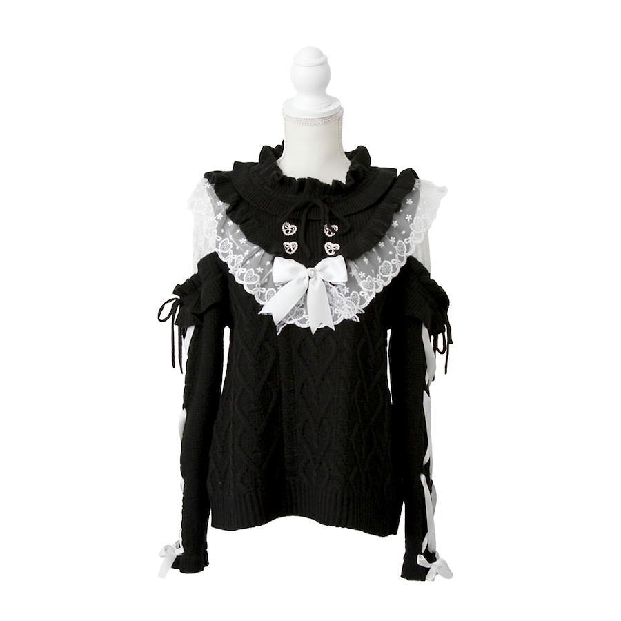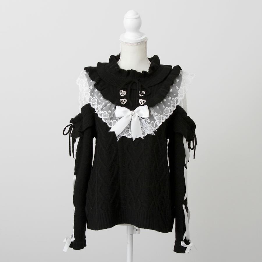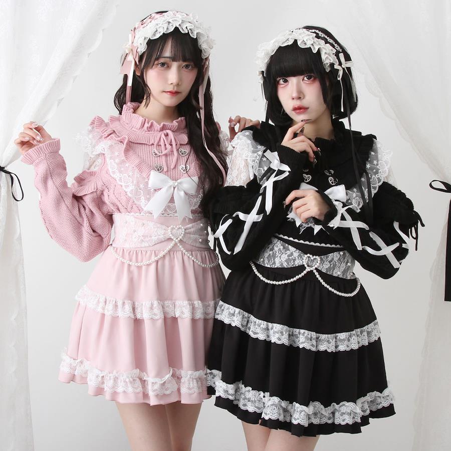 袖レースアップフリルハートビジューニットトップス【デザイン】ハイネックのニットトップスになります。襟部分のフリルがたくさんあって、お好みで調節可能ヨーク部分はキラキラビジューハートリボン釦が付いてます。ハート柄のレースフリルもかわいいポイント♪肩袖部分はレースで透けて肌チラッと見えるのもかわいい配色のレースアップもあり、横から見るも甘かわいい【素材】伸縮性と落ち感のあるニット素材で、春も着やすいサラッとした素材感です。【コーディネート】冬や春にも着れるニットトップス♪甘めコーデにピッタリのアイテムになります。スカートにインするのがオススメです。《透け感》カラーによってあり 《生地の厚さ》普通 《裏地》なし 《伸縮性》ややあり《生産国》中国