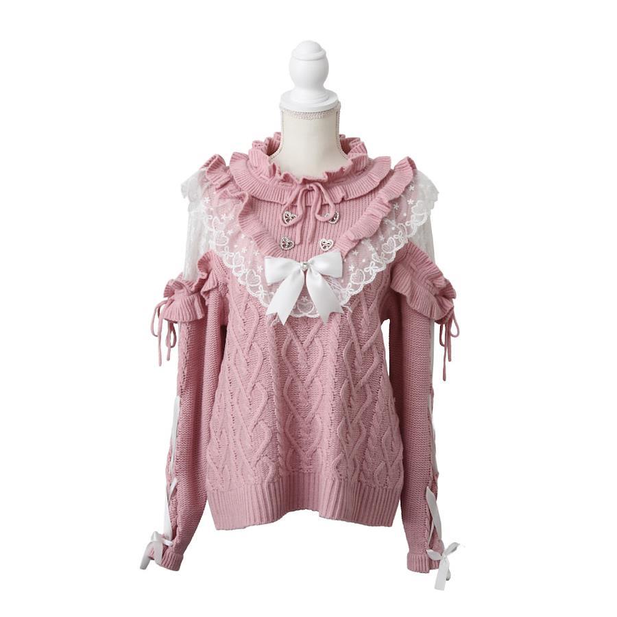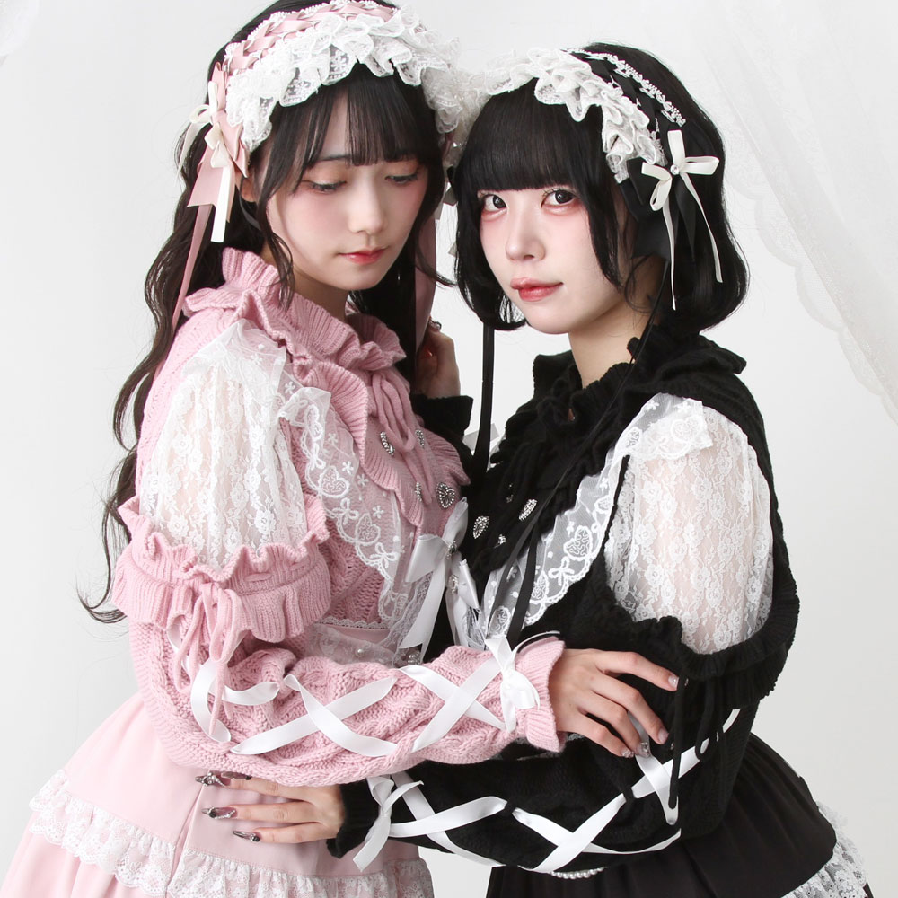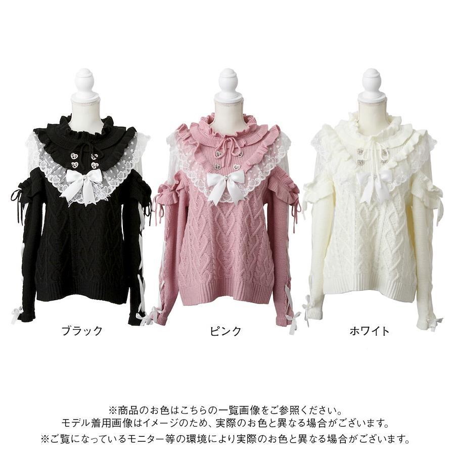 袖レースアップフリルハートビジューニットトップス【デザイン】ハイネックのニットトップスになります。襟部分のフリルがたくさんあって、お好みで調節可能ヨーク部分はキラキラビジューハートリボン釦が付いてます。ハート柄のレースフリルもかわいいポイント♪肩袖部分はレースで透けて肌チラッと見えるのもかわいい配色のレースアップもあり、横から見るも甘かわいい【素材】伸縮性と落ち感のあるニット素材で、春も着やすいサラッとした素材感です。【コーディネート】冬や春にも着れるニットトップス♪甘めコーデにピッタリのアイテムになります。スカートにインするのがオススメです。《透け感》カラーによってあり 《生地の厚さ》普通 《裏地》なし 《伸縮性》ややあり《生産国》中国