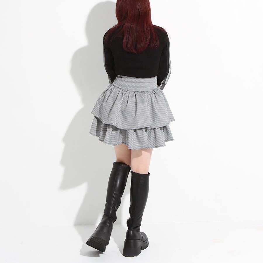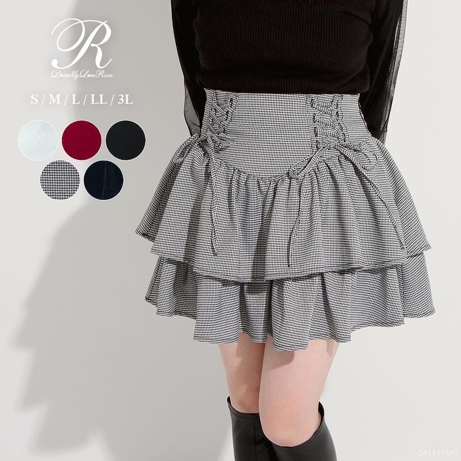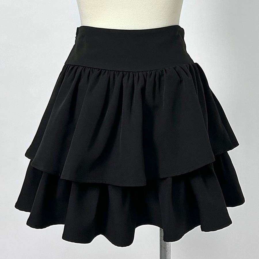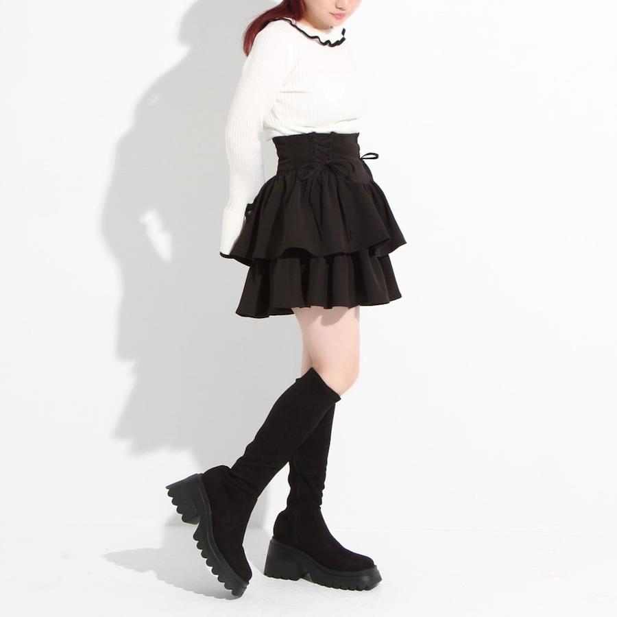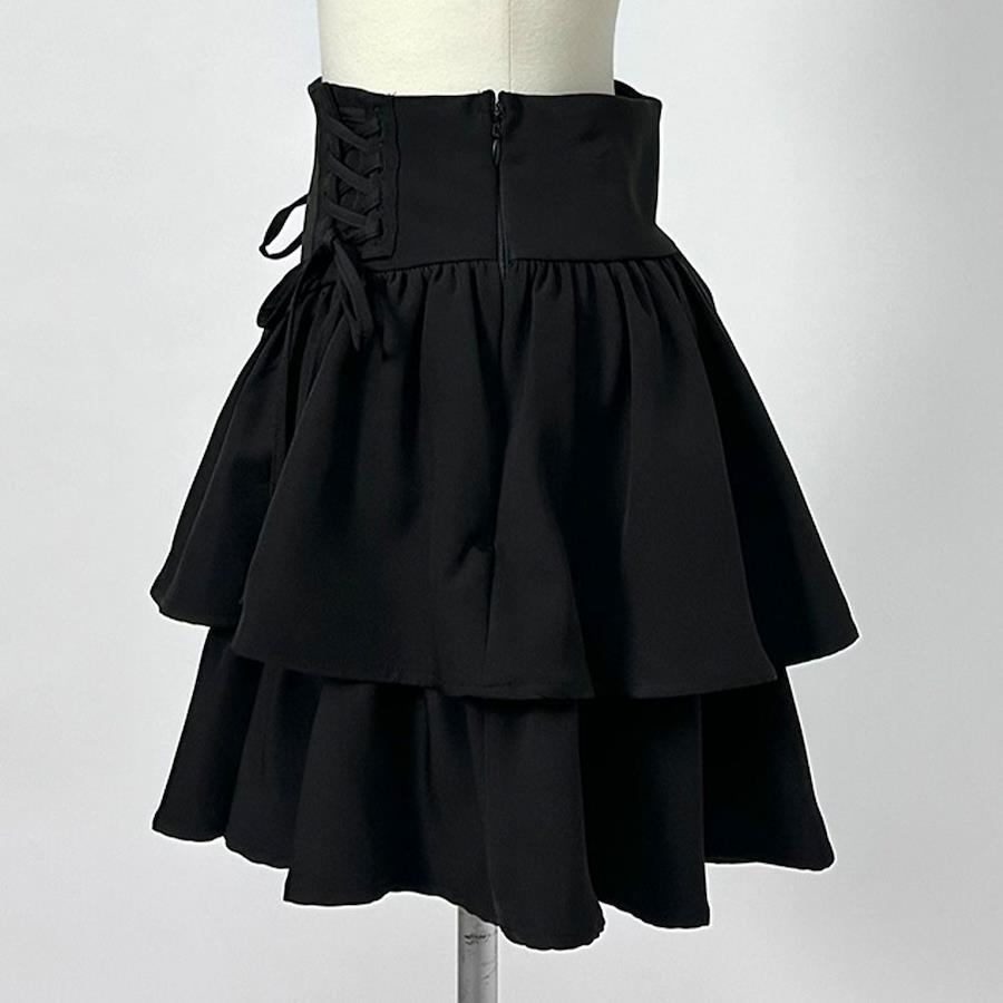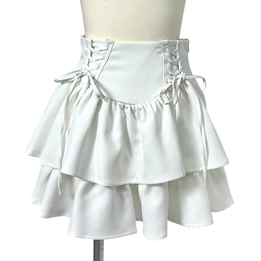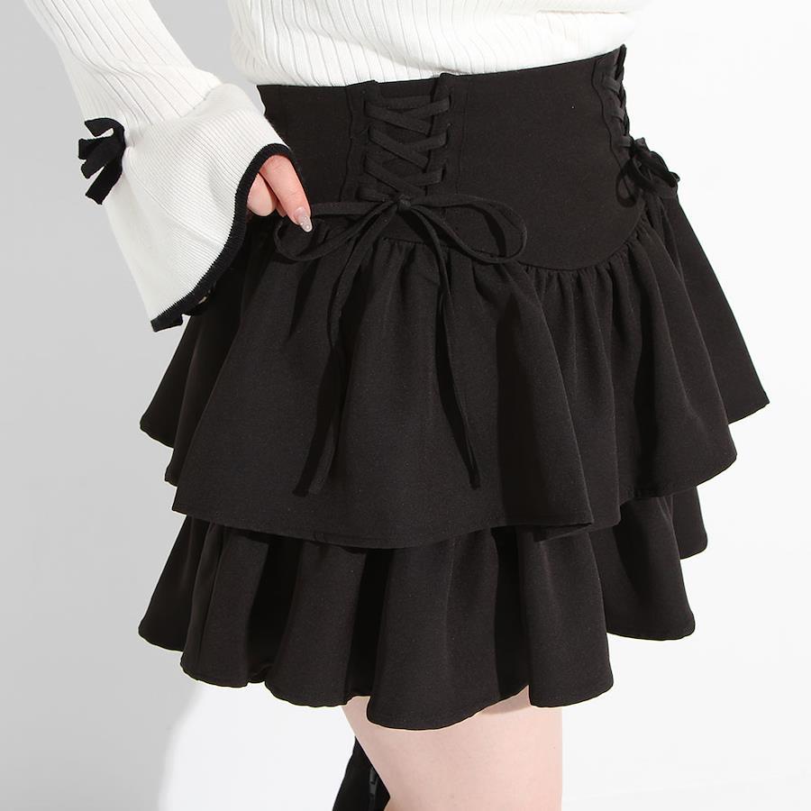 ふりふりのボリューム感が可愛いティアードミニスカートのご紹介。【デザイン】きゅっふわっのメリハリシルエットが可愛い2段ティアードミニスカートです。ウエストはコルセットのようなデザインになっており、レースアップがコーデのアクセントに◎ウエストはゴム無しなので、ウエストラインをすっきり綺麗に見せてくれます。レースアップ部分はご自身で結んでいただく仕様で、ウエスト巾も少しながらきゅっと締めて調整可能。左脇のファスナーを開けて、着脱する仕様になっています。ふわっと可愛いシルエットが写真映えして、着るだけでスタイルアップが叶うアイテムです!