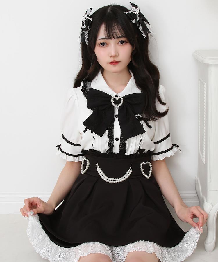 襟元の大きめリボンは取り外しが可能です。ハートパールバックルにレース重ねがポイントに♪