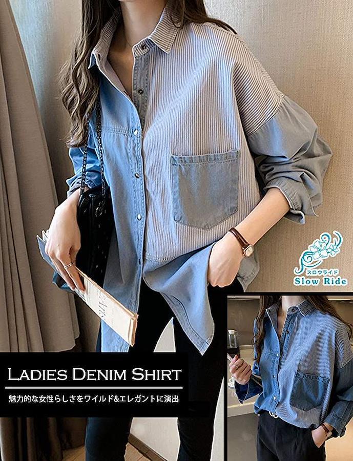 サラッとした感覚が癖になる女性用のルーズなシックデニムシャツ・ステッチストライプのシンプルなデザインながら、