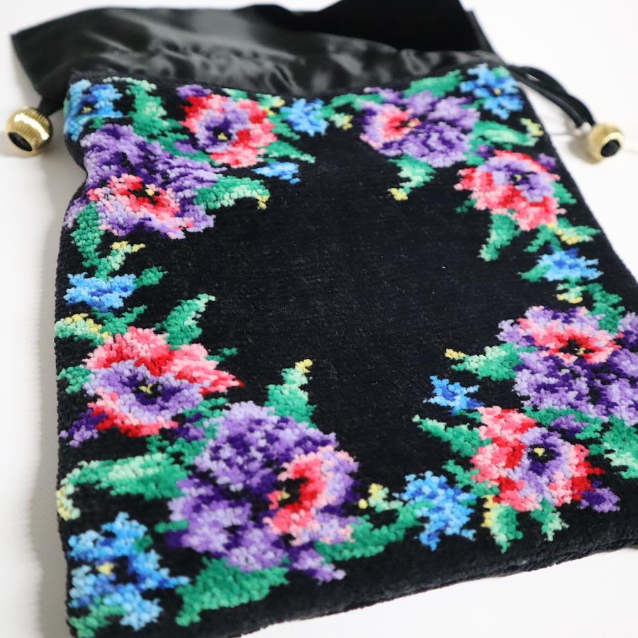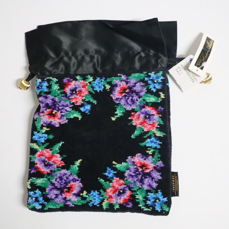 レイクアルスターのシュニール織巾着ポーチです。ブラック地に華やかな花柄が映える、上品で落ち着いたデザイン。バッグの中の小物整理や、ちょっとしたお出かけ用ポーチとしても活躍します。やわらかなシュニール織ならではの高級感があり、ミセス世代の方にも人気のシリーズです。タグ付きの保管品ですので、気持ちよくお使いいただけます。