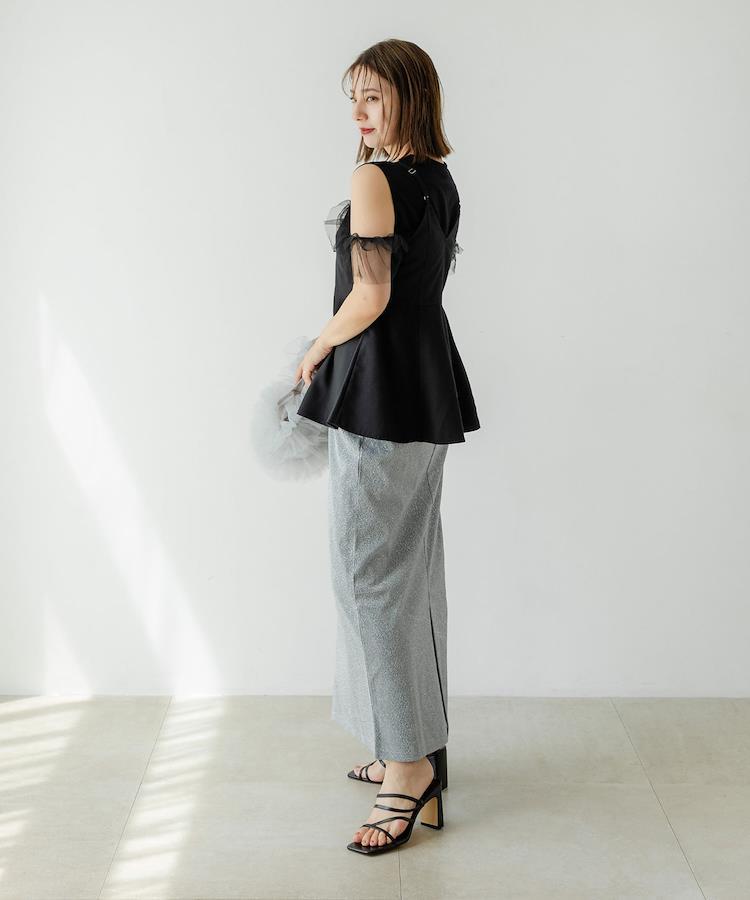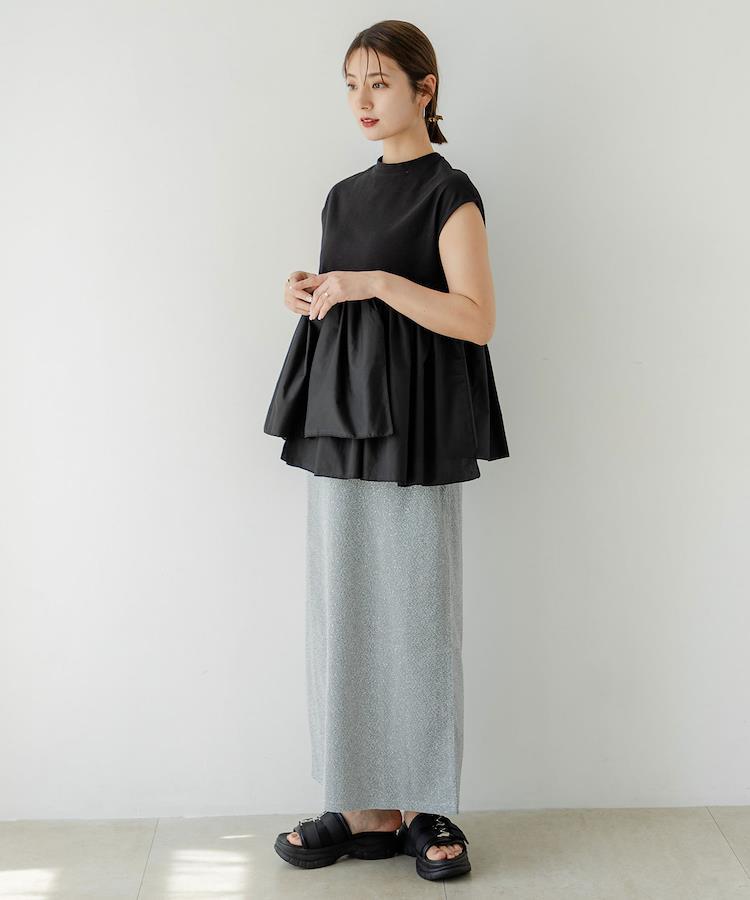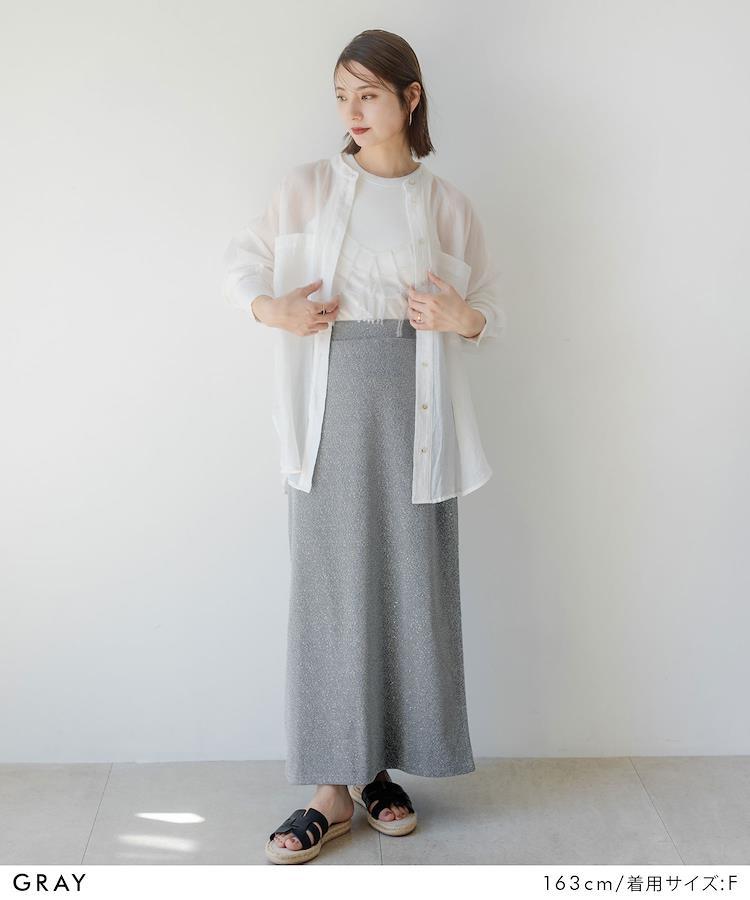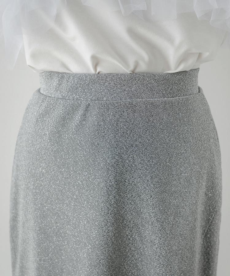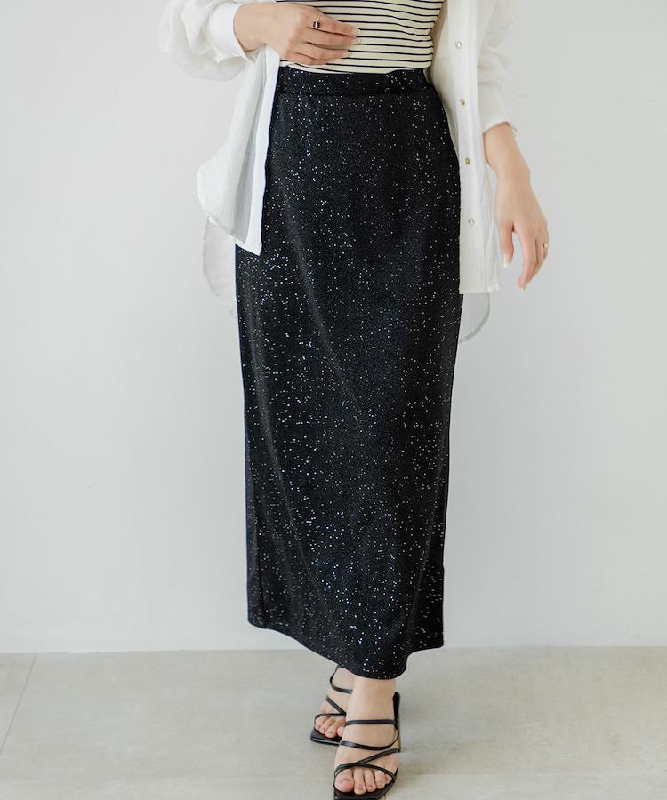 キラキラとしたラメの光沢感が楽しめるナロースカート【ディティール】リラクシーな履き心地のカット素材で仕立てたスカート。派手すぎない程よいラメ感が上品な大人の雰囲気を演出します。フロントウエストは切替デザインになっており、バックウエストはシャーリングゴム仕様になっています。センタースリット入りで足捌きも文句なし。縦ラインを強調し細見え効果抜群のナローラインに、程よくゆとりを持たせたサイジングで体型カバー効果も◎リラクシーな履き心地ながらも、コーデのポイントになりきれい見えする1枚です。【素材感】さらっとした表面感でシーズンレスで着用いただけます。カットソー素材なので非常に着心地がよく、デイリーに手に取りやすいアイテムです。**********************透け感:なし裏地:あり伸縮性:ややあり光沢感:あり生地の厚さ:普通**********************《生産国》中国