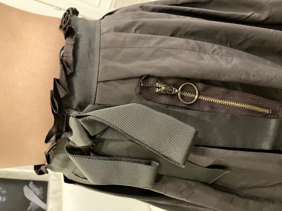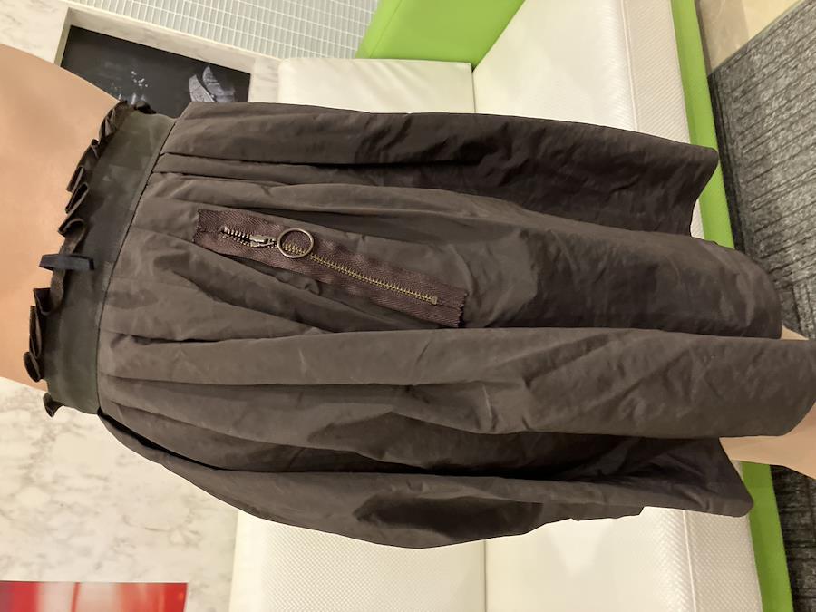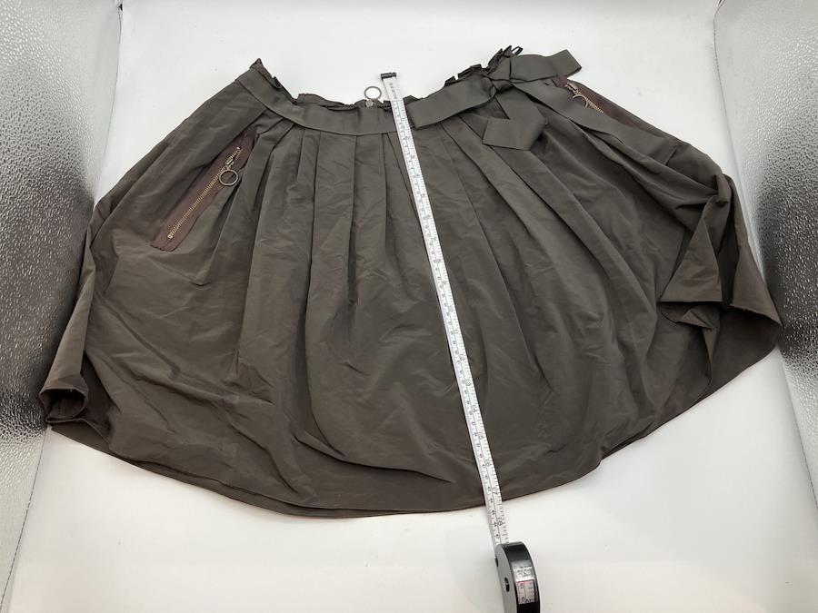 【商品説明】LANVIN en Bleu(ランバンオンブルー)のフェミニンで個性的なデザインスカートです。光沢感あるカーキ系生地と、ウエストのフリル仕立て・グログランリボン・リング付きジッパーなど、細部にまでこだわったディテールが印象的です。サイドからバックにかけてのジップ&リボンの配置がユニークで、360度どこから見ても美しいシルエット。広がりすぎず落ち感のあるAラインで、大人可愛い印象に仕上がります。