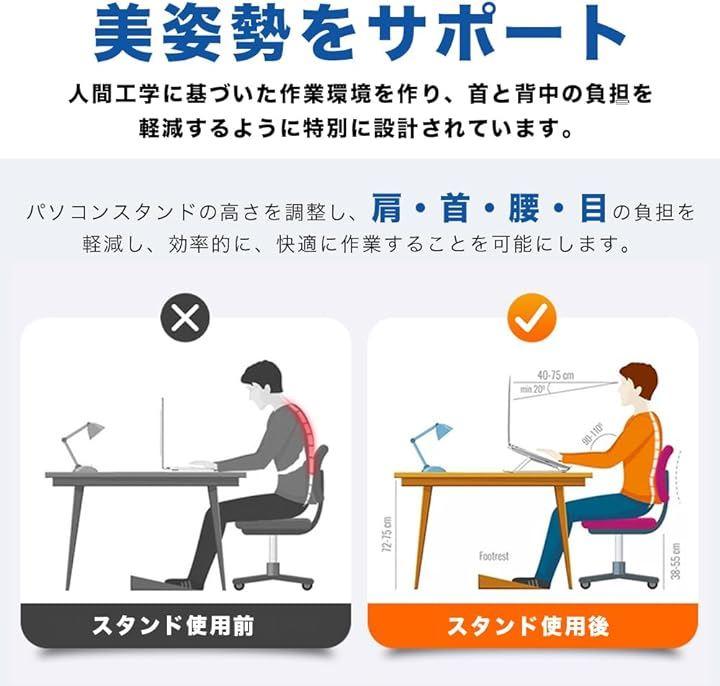 ・美姿勢をサポート 人間工学に基づいた作業環形を作り、肩・首・腰・目の負担を軽減し、効率的に、快適に作業することが可能です。