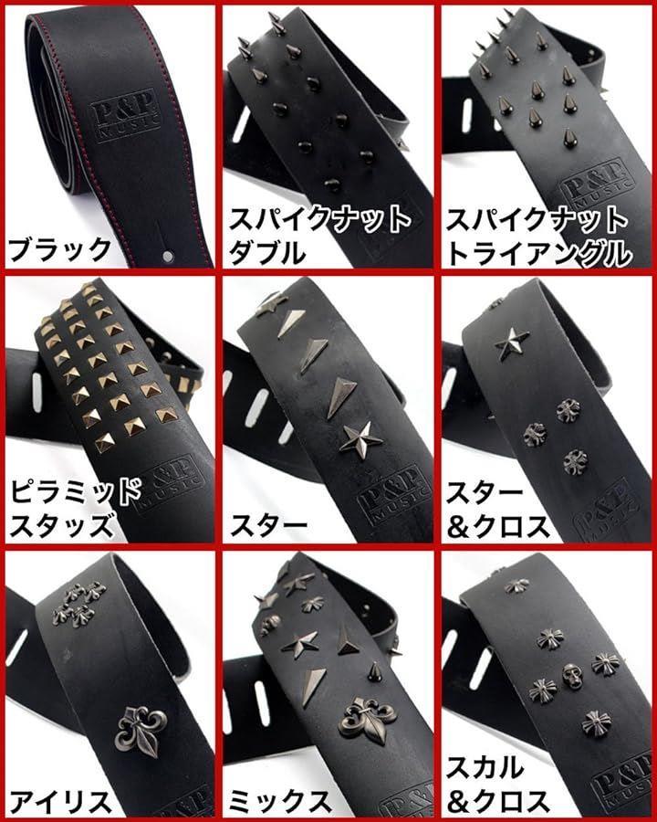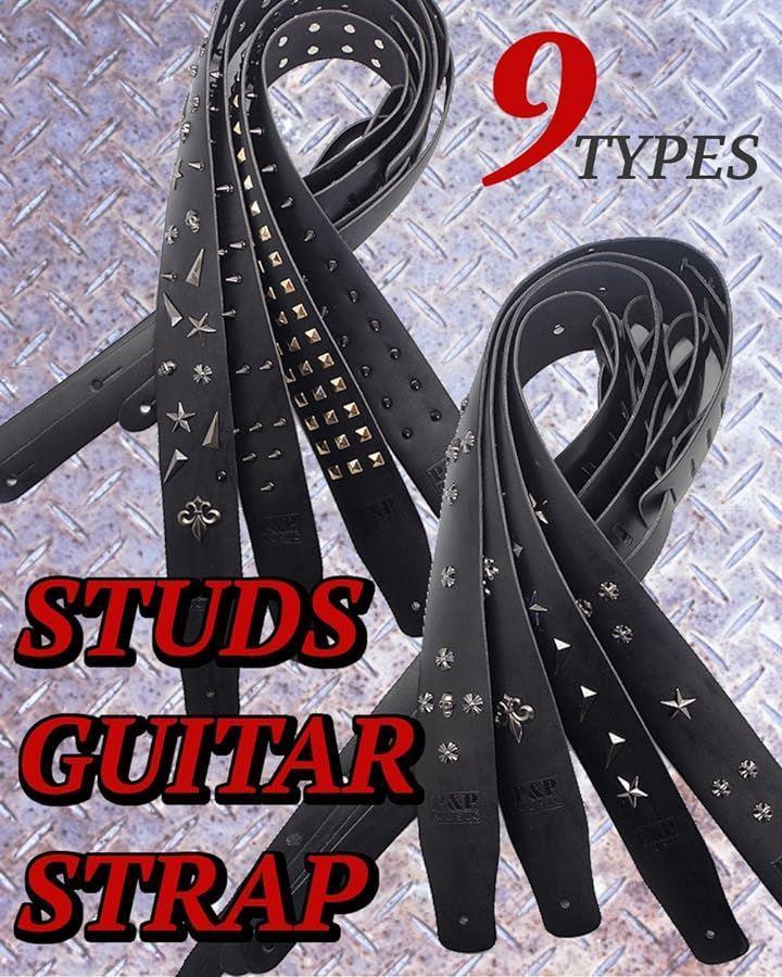 各種スタッズつき本革ギター・ベースストラップです。