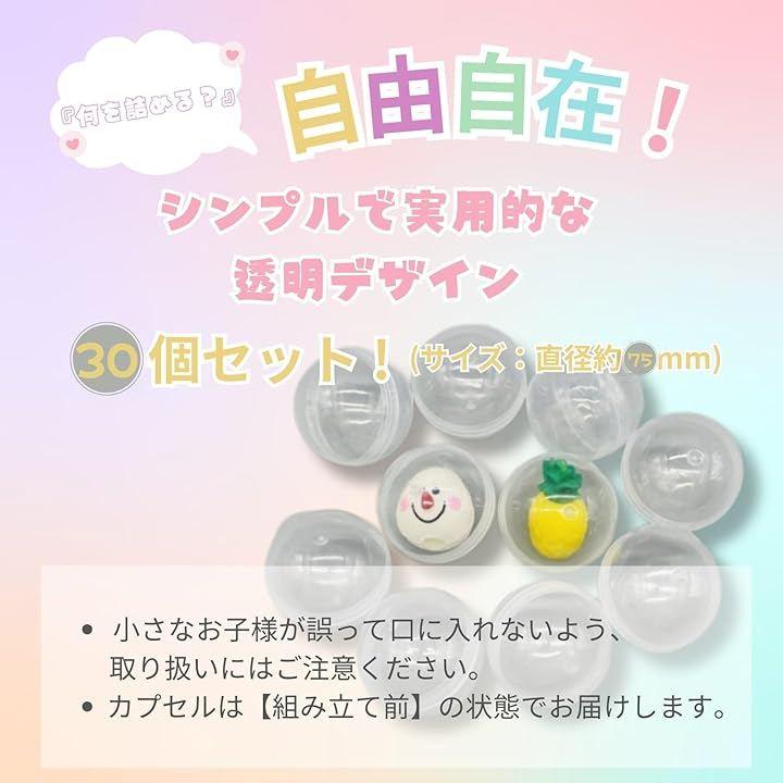 「商品名」透明カプセル 「セット内容」30個セット(未組立状態でお届け) 「サイズ」直径約75mm 「カラー」クリア(透明) 「素材」プラスチック 「用途」クレーンゲーム 小物収納 プレゼント包装 イベント用 「注意事項」誤飲防止のため、小さなお子様の取り扱いには十分ご注意ください。