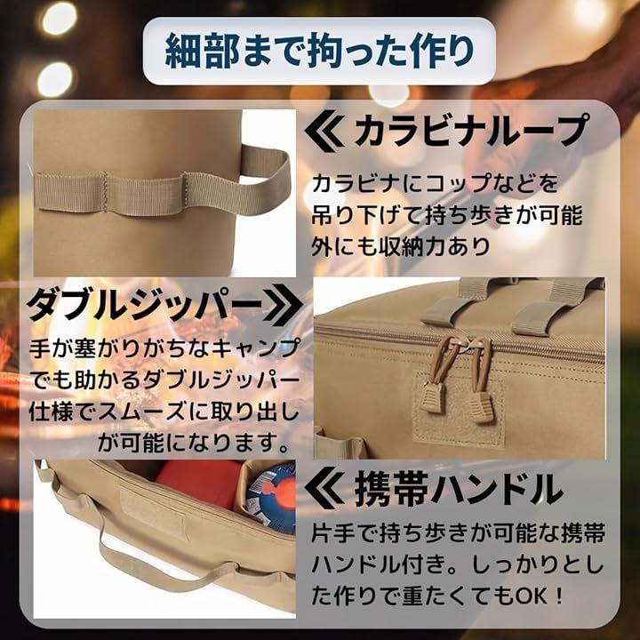 キャンプでの必需品、ガスボンベや小型の鍋、食器など分けて収納可能。