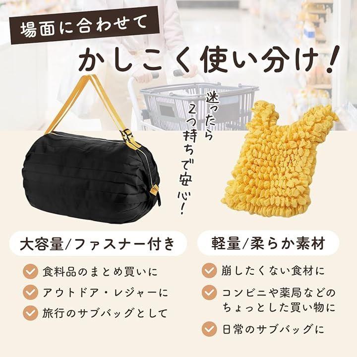 旅行にも日常にも使える。便利な2種類のエコバッグセット 大容量&コンパクトエコバッグ(約40x40cm)と、くしゅくしゅ伸びるエコバッグ(最大高さ50cm/幅45cm)の2点セット。