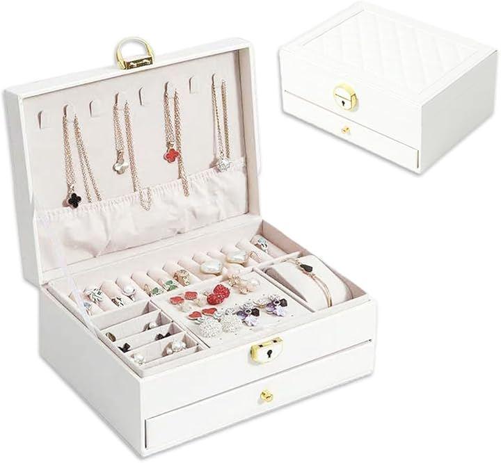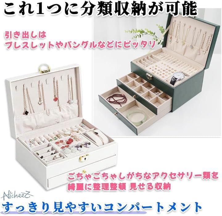 「商品内容」引き出し付きジュエリーボックス(3段タイプ/2段タイプ) 材質:PUレザー カラー:ホワイト/グリーン サイズ:(2段タイプ)幅/約23cm 奥行き/約17cm 高さ/約10cm (3段タイプ)幅/約23cm 奥行き/約17cm 高さ/約13.5cm