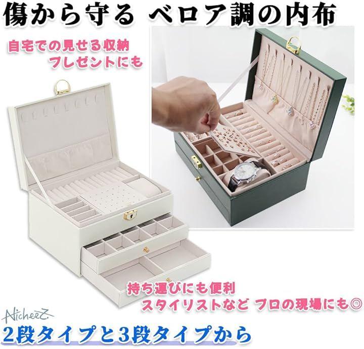 「商品内容」引き出し付きジュエリーボックス(3段タイプ/2段タイプ) 材質:PUレザー カラー:ホワイト/グリーン サイズ:(2段タイプ)幅/約23cm 奥行き/約17cm 高さ/約10cm (3段タイプ)幅/約23cm 奥行き/約17cm 高さ/約13.5cm