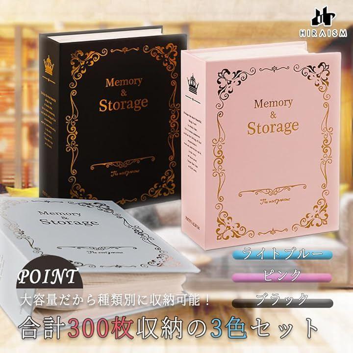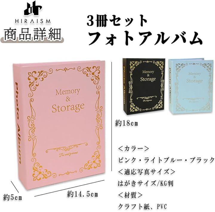 「商品内容」フォトアルバム3冊セット <サイズ>本体:約18cmx14cmx5cm 収納ポケット:約16cmx11.4cm <カラー>ピンク・ライトブルー・ブラック <適応写真サイズ>はがきサイズ/KG判 <材質>クラフト紙、PVC