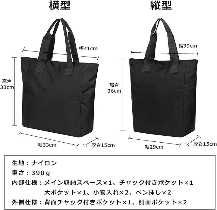v「商品詳細」カラー:ブラック|横型サイズ:下幅33cm(上幅41cm)x高さ33cmx厚さ15cm(手提げ部分高さ:20cm)|縦型サイズ:下幅29cm(上幅39cm)x高さ36cmx厚さ15cm(手提げ部分高さ:20cm)|生地:ナイロン|重さ:390g|内部仕様:メイン収納スペース-チャック付きポケットx1、大ポケットx1、小物入れx2、ペン挿しx2|外側:背面チャック付きポケットx1、側面ポケットx2