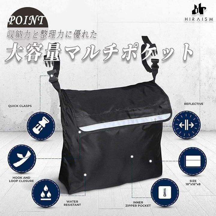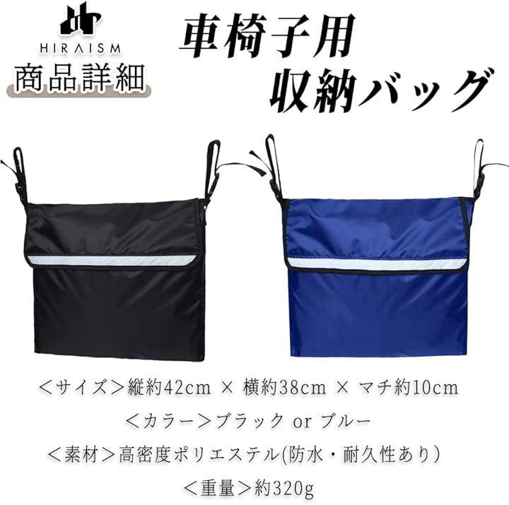 「商品内容」車椅子用収納バッグ <サイズ>縦約42cm x 横約38cm x マチ約10cm <カラー>ブラック or ブルー <素材>高密度ポリエステル防水・耐久性あり) <重量>約320g