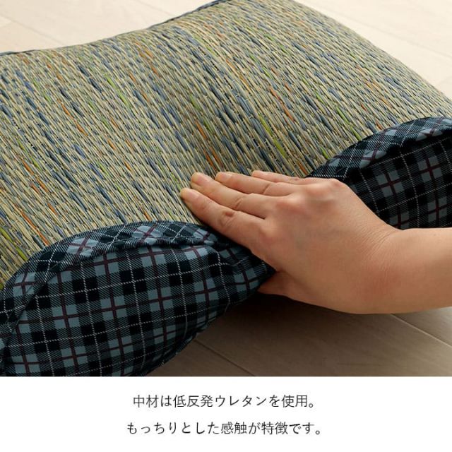 "チェック柄のおしゃれない草のフィットクッション。腰当てやお昼寝用の枕、足枕など、いろんな使い方が出来ます。中材は低反発ウレタンを使用。もっちりとした感触が特徴です。い草の調湿効果で長時間座ってもムレにくく、快適にお過ごしいただけます。快眠い草の効能として1.綿の約2.5倍の吸湿力2.蒸れにくい。汗による湿気を吸うことにより温度を下げ快適な就寝を促します。3.汗のにおいを軽減。汗のにおいの元となる化学物質を90%以上抑えます。などがあります。暑苦しい日本の夏でも汗のジメジメを軽減してくれます。