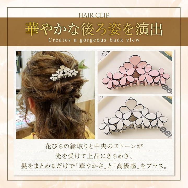 花びらの縁取りと中央のストーンが光を受けて上品にきらめき、髪をまとめるだけで後ろ姿に華やかさと高級感をプラスします。