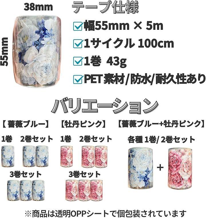 「素材」PET:光沢のある白インク剥離紙「サイズ」(薔薇、ブルー)1巻55mmx5m、1ループ約100cm (牡丹、ピンク)1巻60mmx6m、1ループ約150cm