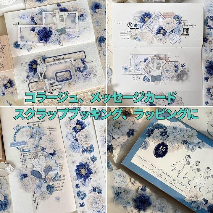「華やかな大輪の花柄」大輪のブルーのバラとピンクの牡丹を繊細に描いたマスキングテープ。