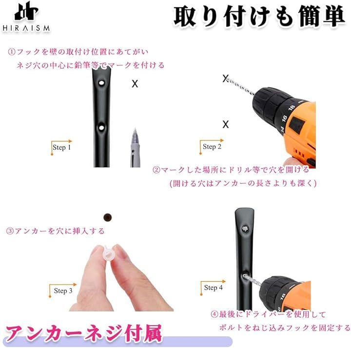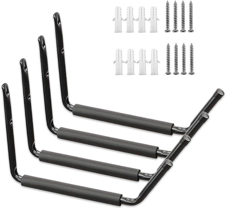 「商品内容」ガレージフック:4個セット カラー:ブラック サイズ:高さ27cm アーム長さ29cm アーム立ち上がり13cm セット内容:アームx4本 ネジ:8本 アンカー:8個 適用アイテム:サーフボード、スノーボード、カヤック、ロードバイク、カヌー、スキーボード、SUPボード、脚立、はしご、建築資材、材木等、様々な大型アイテムに。