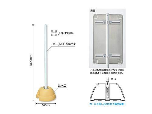 片面式の看板と注水式土台、ポールがセットになった大型のスタンド看板です。サイズ: [組立時]高さ182cm×横50cm×奥行き50cm [パネルサイズ]高さ68cm×横40cm 厚み0.9mm [ポールサイズ]高さ180cm×直径6.05cm [ベースサイズ]高さ26cm×直径50cm素材: [ポール]鉄(白塗装) [ベース]高密度ポリエチレン [表示パネル]アルミ(カール・平リブタイプ)重量: [ポール]約6.2kg [ベース]約3kg(満水時約33kg) [表示パネル]約1.1kg※寒冷地域では不凍液をご使用ください。 ※組み立て式となります。