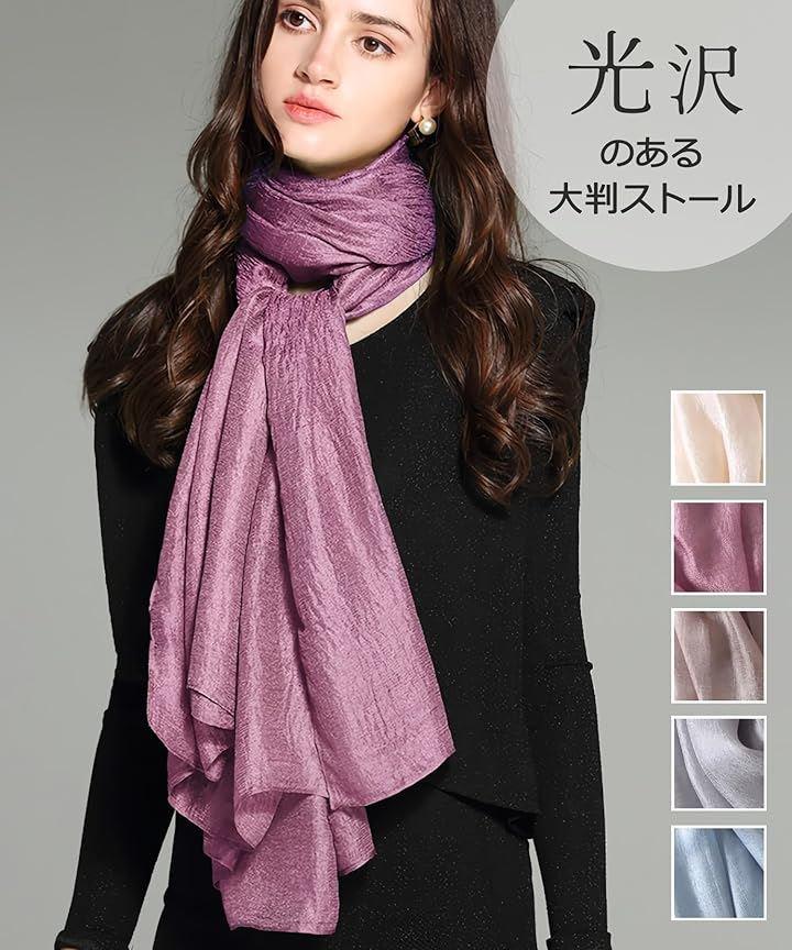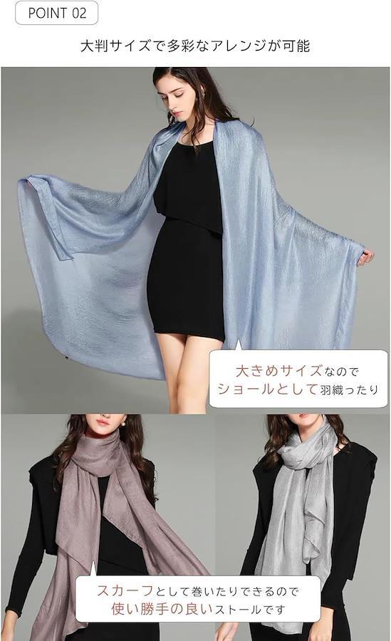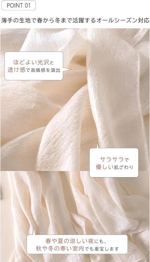 「オールシーズン対応の薄手素材」このストールは、薄手の生地で春から冬まで活躍するオールシーズン対応です。