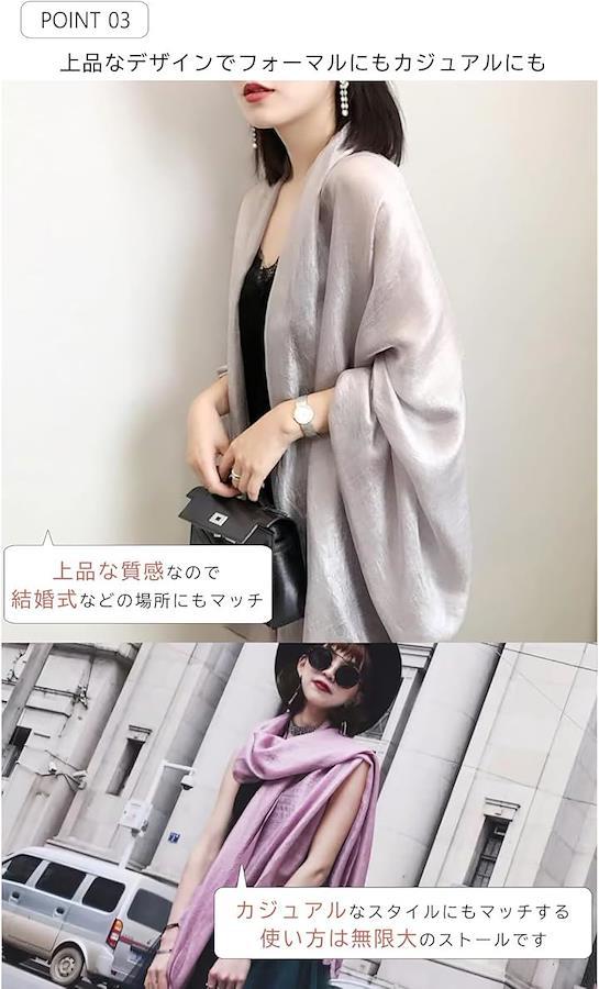 「光沢で高見え」このストールは艶やかな光沢があり、見栄えが良いため、結婚式や披露宴、二次会などから、お呼ばれ、食事会、演奏会、発表会、謝恩会、パーティーなど様々なシーンでご利用いただけます。