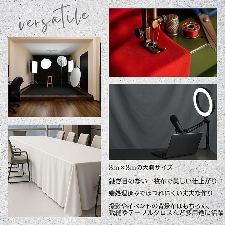 「大判3mx3m 背景布|撮影・動画配信・フォトブースに最適」 3mx3mの大判サイズで、写真撮影・動画撮影・ライブ配信・リモート会議・商品撮影・人物撮影・ポートレート撮影など幅広い用途に使える撮影用背景布です。
