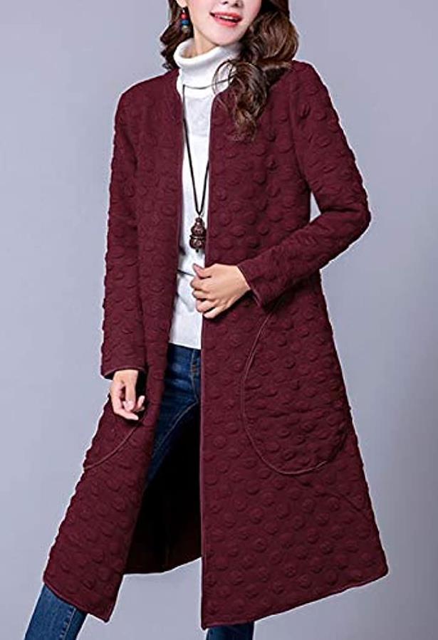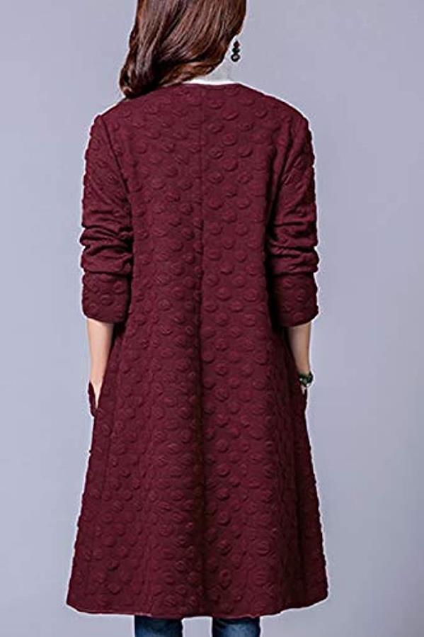 ウォーミーなロング丈にはスタイルカバー効果も・Vネックと、フィットした丈長のロングシルエット、水玉模様の上質な素材感。