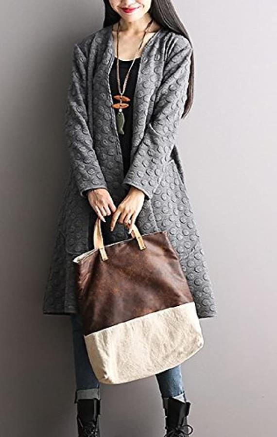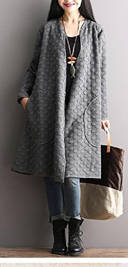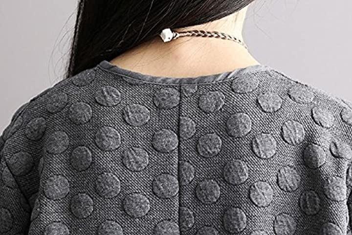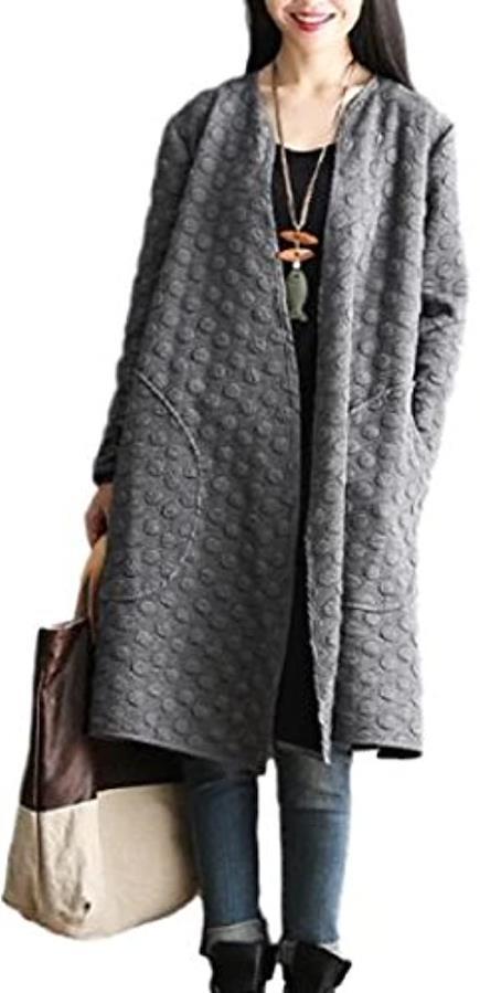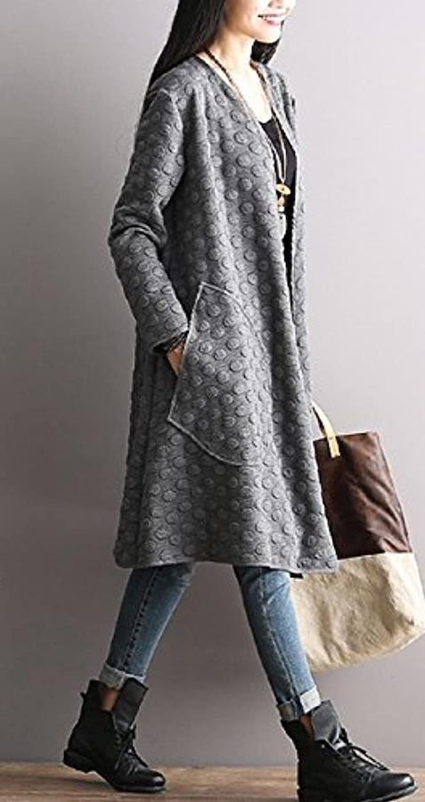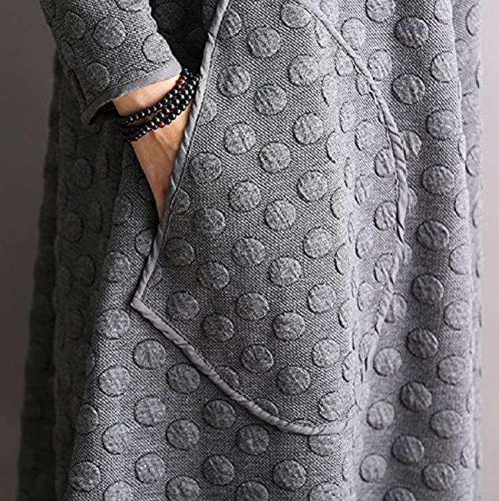 ウォーミーなロング丈にはスタイルカバー効果も・Vネックと、フィットした丈長のロングシルエット、水玉模様の上質な素材感。