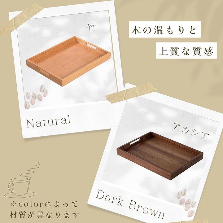 「天然素材」ナチュラルカラー:竹、ダークブラウンカラー:アカシア の天然木を使用し、木の温もりと上品な質感を楽しめる木製トレイです。