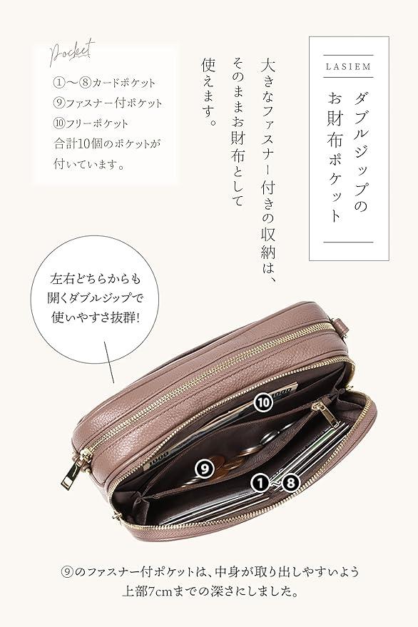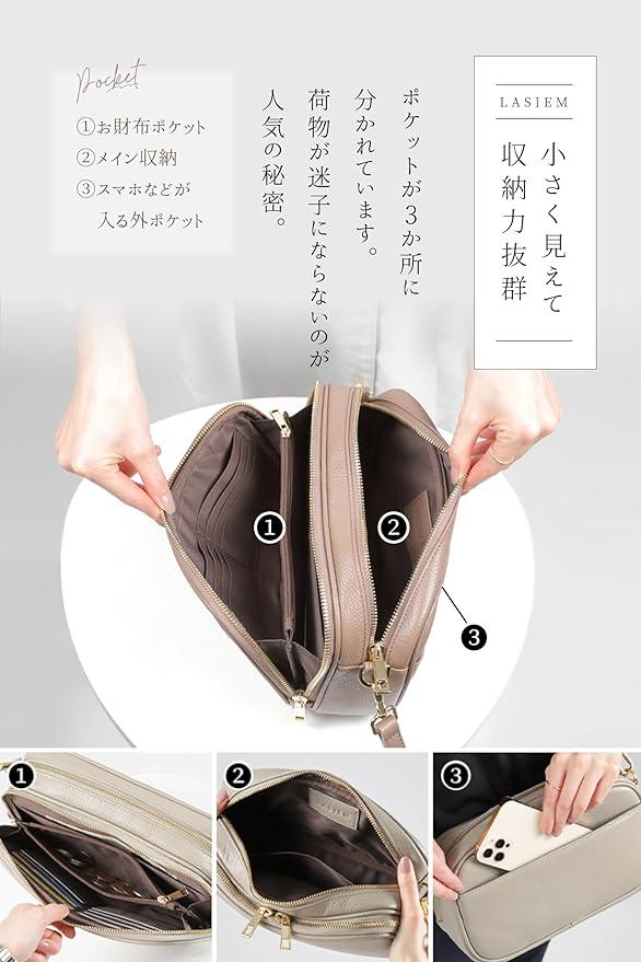 ■商品説明?【小さく見えて、収納力抜群!】3か所の収納 (1)お財布ポケット (2)メイン収納 (3)スマホなどが入る外ポケット の3か所に分かれています。 荷物が迷子になりません。【たくさん入って整理しやすい!】ダブルジップのお財布ポケット 大きなファスナー付きの収納は、そのままお財布として使えます。 (1)カードポケット8 (2)フリーポケット1 (3)ファスナー付ポケット1 の合計10個のポケットが付いています。 (3)のファスナー付ポケットは、中身が取り出しやすいよう上部7cmまでの深さにしました。左右どちらからも開くダブルジップなので、使いやすさも抜群です。【こんなにたくさん入ります! 】カード8枚、お札2枚に小銭14枚、鍵、500mlペットボトル、スマホ、アルコールスプレー、ポーチ… 必要なものは全部入る収納力!【両方とも長さ調整OK!】ショルダーベルト2本付 カジュアルにはトレンドの太ベルトを。大人だけのお出かけには、上品な細ベルトをご使用いただくのがおすすめです。【トレンド感◎の4カラー】 トレンドのニュアンスカラー、ベージュ系は色味にこだわり、差し色に使いやすいシルバーも。 大人にふさわしい上品な色合いなので、コーディネートに合わせて、気分の上がるカラーをお選びください。
